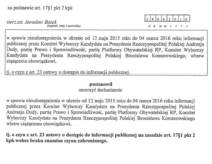 Okazała się jednak, że były to tylko obietnice wyborcze. Oba komitety nie udostępniły wnioskowanych informacji, dlatego złożyliśmy zawiadomienie o możliwości popełnienia przestępstwa. Rok po złożeniu zawiadomienia nastąpiło umorzenie dochodzenia – postanowienie z 28 czerwca 2016 r., RDS-399/16.