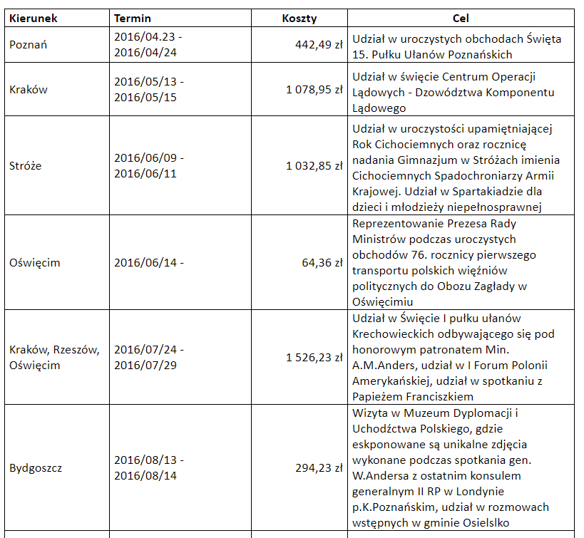 - informacji o wszystkich wyjazdach służbowych Anny Marii Anders od 2015 r., poprzez podanie miejsca wyjazdu, celu wyjazdu, daty wyjazdu oraz informacji o poniesionych kosztach w związku z wyjazdem,