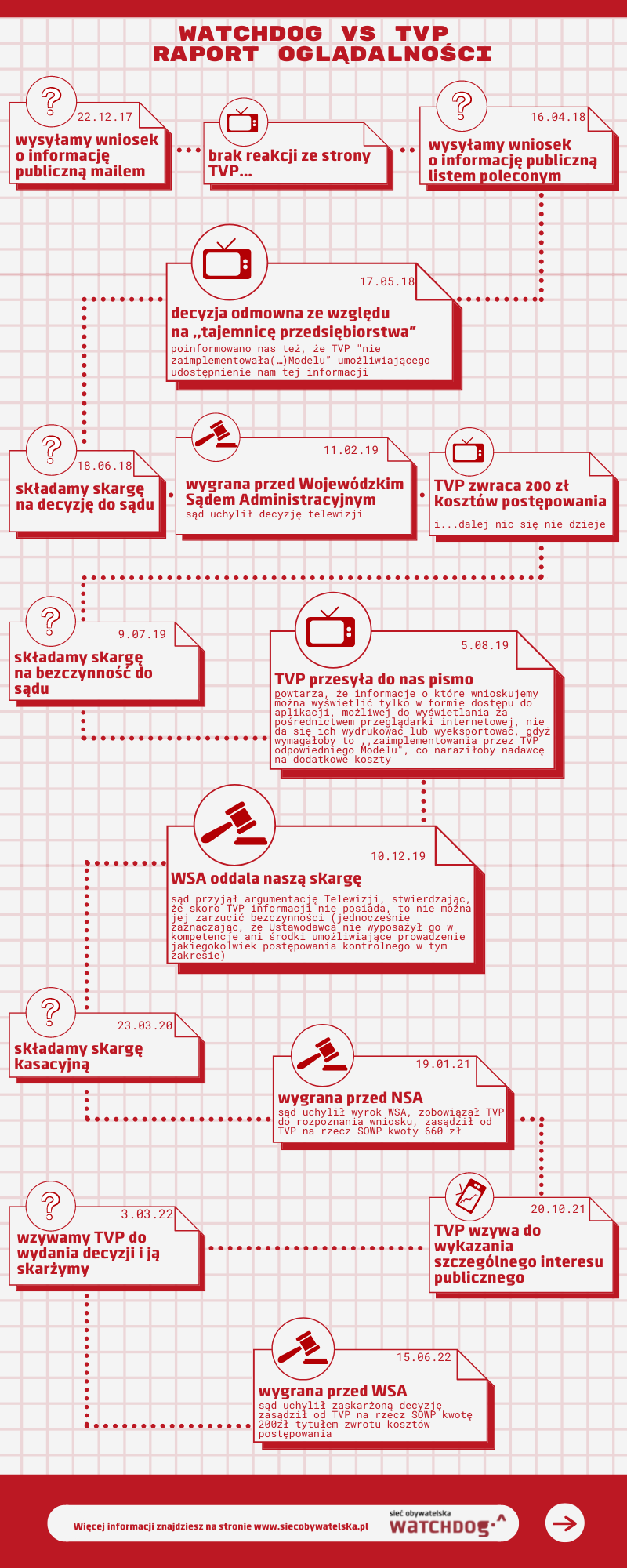 Wojewódzki Sąd Administracyjny, sygn. II SA/Wa 613/22, pochylając się nad naszą skargą, uchylił zaskarżoną decyzję, zasądził od Telewizji Polskiej S.A. na naszą rzecz kwotę 200 zł tytułem zwrotu kosztów postępowania. Są przypomniał również o tym, co półtora roku temu wskazał NSA – w pierwszej odpowiedzi na wniosek TVP nie wspomina o żadnych problemach technicznych, tylko powołuje się na tajemnicę przedsiębiorcy, co oznacza, że tę informację posiada, tylko nie chce jej udostępnić. Jeśli telewizja nie mogła zrealizować wniosku w formie elektronicznej z powodu przeszkód technicznych, powinna od razu o tym poinformować i wskazać, w jakiej innej formie dane mogą być udostępnione.