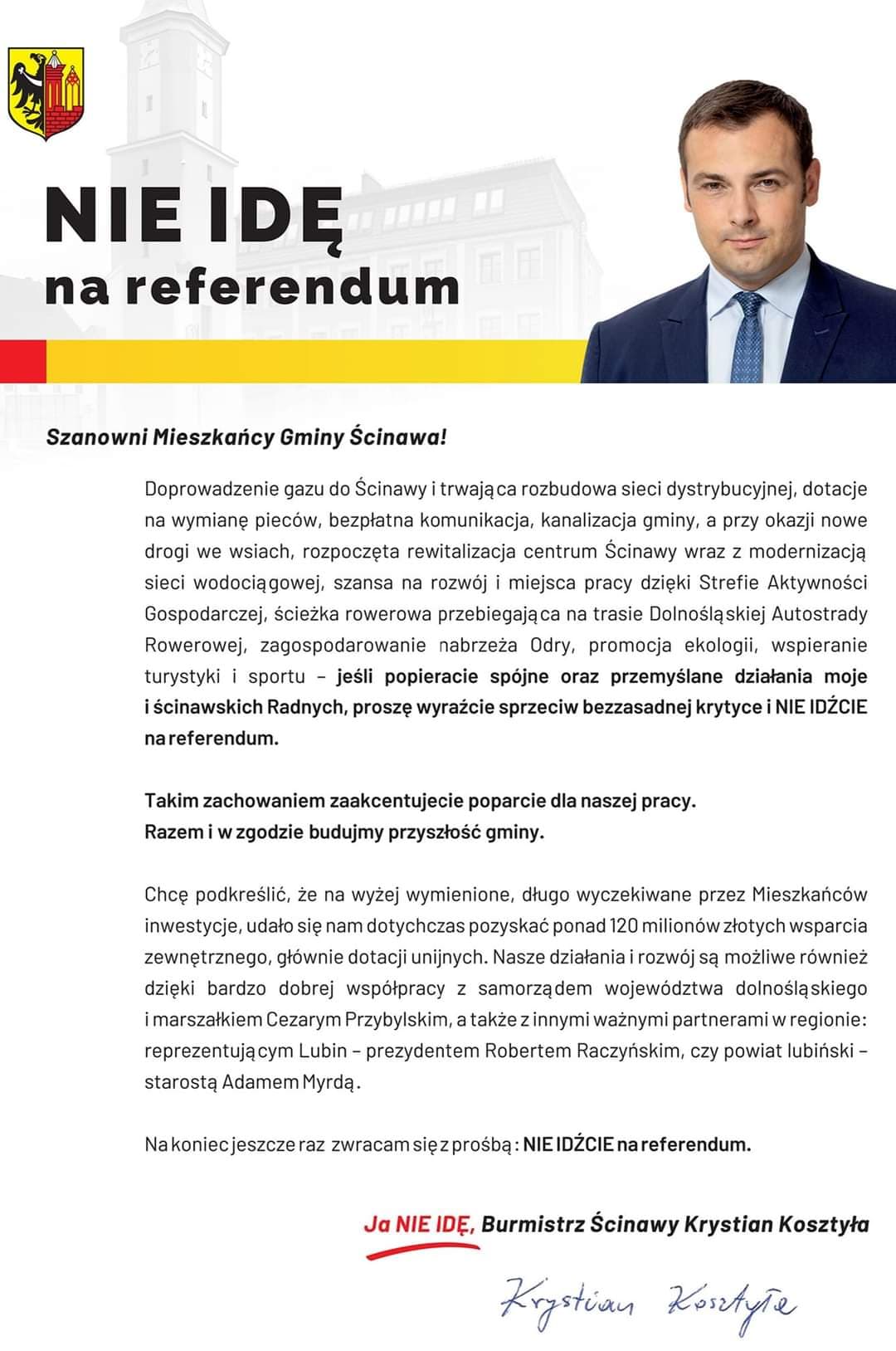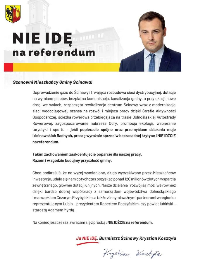 W związku z opublikowaniem w Internecie filmu, na którym Burmistrz Ścinawy zniechęca mieszkańców do udziału w referendum (nagranie) oraz rozprowadzaniem na terenie gminy ulotek o podobnej treści (treść ulotki), jako organizacja chcemy podkreślić, że jest to działanie niezgodne ze standardami demokratycznego państwa.