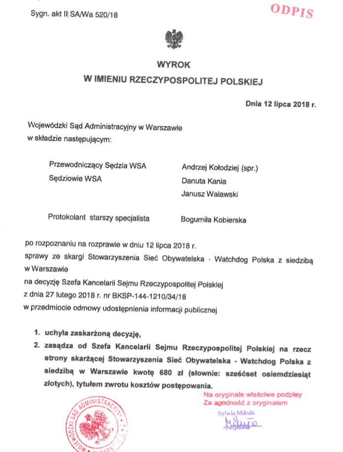 Sąd odniósł się do podstawowych argumentów Szefa Kancelarii Sejmu RP i stwierdzi, że jawność ma pierwszeństwo w tym wypadku.