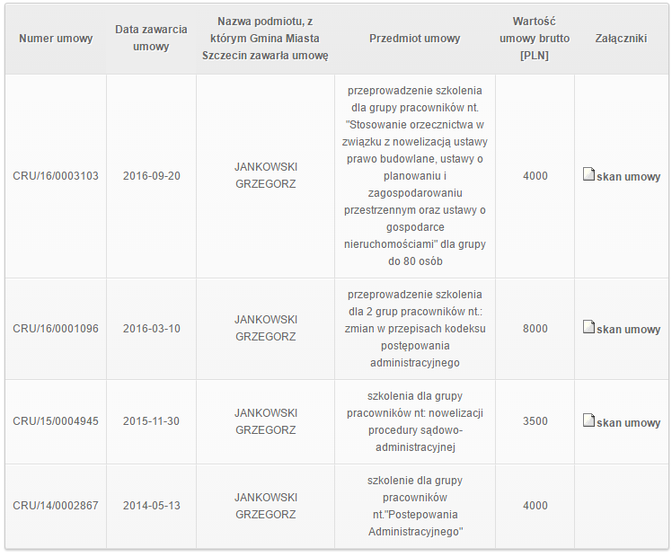 Z rejestru umów (dostępny w BIP-ie urzędu) zawieranych przez Miasto Szczecin wynika, że Grzegorz Jankowski, który jednocześnie jest Prezesem Wojewódzkiego Sądu Administracyjnego w Szczecinie, prowadził szkolenia dla osób zatrudnionych w Urzędzie Miasta Szczecin.