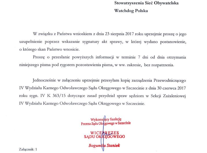 Dlatego też złożyliśmy do WSA w Szczecinie skargę na bezczynność, w której podkreśliliśmy, że w karnej ustawie procesowej znajdują się przepisy dotyczące uzyskiwania dostępu do akt sądowych oraz możliwości uzyskiwania z nich uwierzytelnionych kopii i odpisów (w szczególności taką rolę pełni art. 156 KPK). Mimo to wprowadzenie takiej regulacji nie uniemożliwia osobom niebędącym stronami postępowania karnego korzystania z uprawnień przewidzianych w UDIP. Nieuzasadniony wydaje się również argument, że postanowienie zostało wydane w niezakończonym jeszcze postępowaniu przygotowawczym. Zgodnie z art. 6 ust. 1 pkt 4 lit. a tiret trzecie UDIP udostępnieniu polegają w szczególności orzeczenia sądów powszechnych, Sądu Najwyższego, sądów administracyjnych oraz sądów wojskowych i nie ma tam rozróżnienia na orzeczenia merytoryczne i niemerytoryczne oraz w postępowaniu zakończonym i niezakończonym. Uzależnienie stosowania przepisów UDIP od stadium trwającego postępowania nie powinno mieć miejsca, tym bardziej, iż nie ulega zmianie podmiot wydający postanowienie będące przedmiotem wniosku Stowarzyszenia.