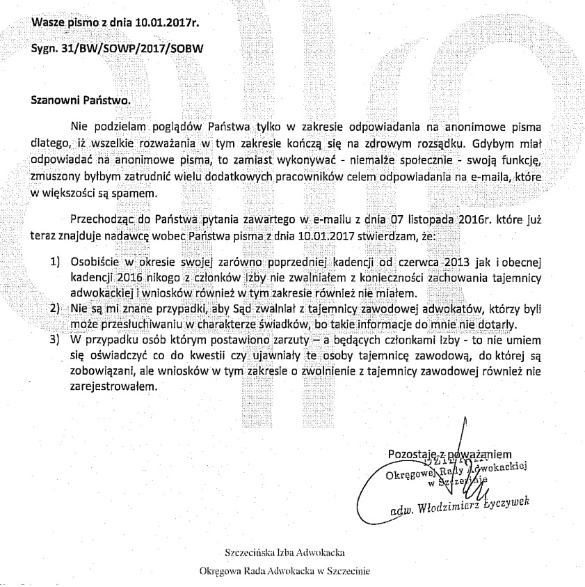 Mecenas Włodzimierz Łyczywka, dziekan ORA w Szczecinie, nie odpowiada na anonimowe wnioski, ponieważ nie ma na to czasu. Czy to wystarczający powód?