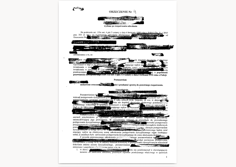 Finalnie spłynęło do nas mnóstwo danych. O ile przesłanie informacji o liczbie orzeczeń dyscyplinarnych zaskarżonych do sądu administracyjnego oraz przypadkach powołania komisji do zbadania zaskarżonego orzeczenia nie sprawiały komendom trudności, o tyle udostępnienie skanów orzeczeń dyscyplinarnych nie poszło tak łatwo.