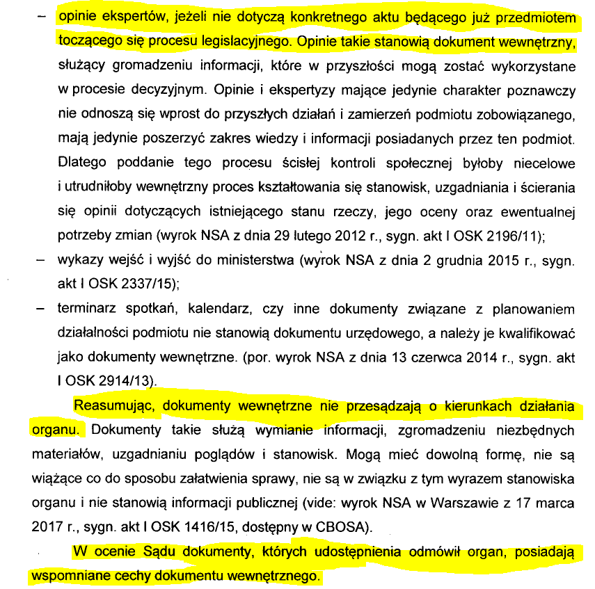 (…) od „dokumentów urzędowych” (…) odróżnia się „dokumenty wewnętrzne” służące wprawdzie realizacji jakiegoś zadania publicznego, ale nie przesądzające o kierunku działania organu. Dokumenty takie służą wymianie informacji, zgromadzeniu niezbędnych materiałów, uzgodnieniu poglądów i stanowisk. Mogą mieć dowolną formę, nie są wiążące co do sposobu załatwienia sprawy, nie są w związku z tym wyrazem stanowiska organu, nie stanowią więc informacji publicznej.