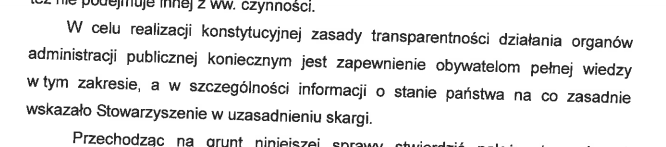W uzasadnieniu Sąd wskazał, że treść dokumentów wytworzonych przez organy władzy publicznej oraz wystąpień i ocen przez nich dokonywanych, niezależnie od tego, do jakiego podmiotu są one kierowane i jakiej sprawy dotyczą, stanowi informację publiczną! Ponadto zauważono, że w celu realizacji konstytucyjnej zasady transparentności działania organów administracji publicznej koniecznym jest zapewnienie obywatelom pełnej wiedzy, w szczególności w zakresie informacji o stanie państwa.