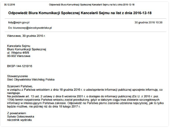 30 grudnia 2016 r., czyli ostatniego dnia, w którym Kancelaria Sejmu RP jeszcze mieściła się w ustawowym terminie, otrzymaliśmy trzy podobne odpowiedzi na złożone przez nas wnioski. W każdym z maili poinformowano o tym, że na podstawie art. 13 ust. 2 Ustawy o dostępie do informacji publicznej termin rozpatrzenia wniosku został przedłużony do 18 lutego 2017 r., czyli maksymalnego, 2-miesięcznego terminu, o którym stanowi art. 13 ust. 2 UDIP.