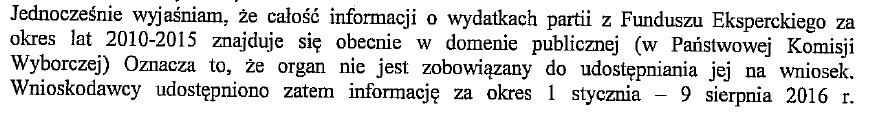 Informacje o wydatkach poniesionych w ramach Funduszu Eksperckiego w latach 2010‐2015 zostały zawarte w sprawozdaniach finansowych partii za lata 2010‐2015 i złożone w całości w Państwowej Komisji Wyborczej. Znajdują się one zatem obecnie w domenie publicznej i są dostępne dla wszystkich. Uprzejmie informuję, że zgodnie z jednolitym orzecznictwem sądów administracyjnych, obowiązek udostępniania informacji publicznej nie dotyczy takich informacji, które już znajdują się w domenie publicznej. W przypadku otrzymania wniosku dotyczącego takiej informacji, organ nie jest zobligowany do jej dodatkowego lub ponownego udostępniania.