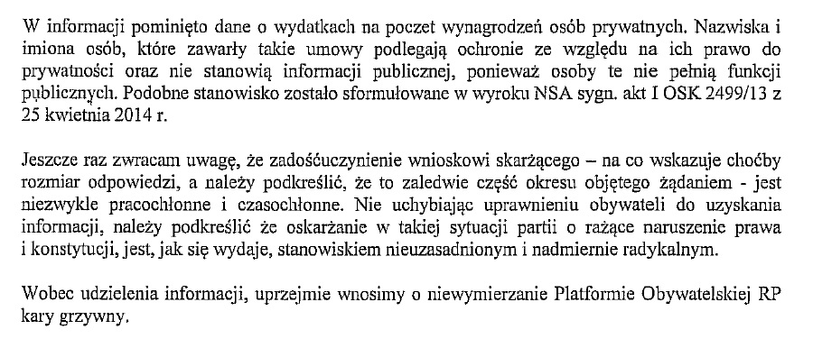 Złożyliśmy wniosek o ponowne rozpatrzenie sprawy, który jednak nie przekonał Platformy Obywatelskiej do zmiany stanowiska. Co więcej, w drugiej z decyzji z 19 stycznia 2017 r. rozwinięto argumentację na rzecz nieprzekazywania nam żądanych informacji m.in. o następujący argument: