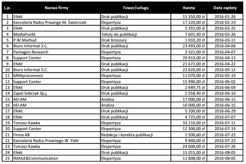- informacji o tytułach publikacji, których wydrukowanie, redakcja lub korekta zostały opłacone przez partię ze środków, zgromadzonych w Funduszu Eksperckim w czasie od 1 stycznia 2016 r. do 8 sierpnia 2016 r.