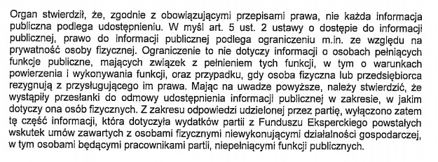 W odpowiedzi na wniosek (do którego partia odniosła się po złożeniu skargi na bezczynność) wskazano, że: