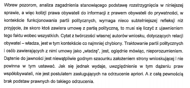 Co ciekawe, w dalszej części PO uznała, że nie jest zobowiązana do udostępniania żądanej przez Sieć Watchdog informacji, bo całość informacji o wydatkach partii z Funduszu Eksperckiego „znajduje się obecnie w domenie publicznej (w Państwowej Komisji Wyborczej)”. Dodać trzeba, że taki argument nie znajduje jakiejkolwiek podstawy w obowiązującym prawie, bo jedyne, co może zwolnić podmiot zobowiązany z udzielania odpowiedzi na wniosek, jest zamieszczenie określonej informacji na stronie Biuletynu Informacji Publicznej.