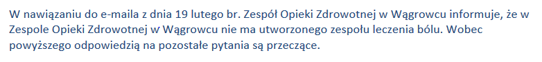 Żaden szpital nie zbiera przy wypisie od pacjentów informacji, czy procedury leczenia bólu były w ich przypadku wystarczające, choć Szpital Miejski i. Franciszka Raszei w Poznaniu nie wyklucza wprowadzenia takiej ankiety dla pacjentów.