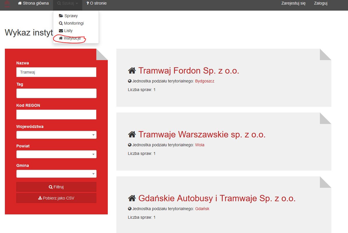 Jeśli chcecie sprawdzić, czy interesująca Was spółka została uwzględniona w naszym monitoringu, wyszukacie ją, ograniczając w analizie obszar do jednego powiatu. Jeśli tam jej nie znajdziecie, to może oznaczać, że nie zareagowała na nasz wniosek – można to sprawdzić tutaj – https://fedrowanie.siecobywatelska.pl/ Wystarczy wybrać opcję wyszukiwania instytucji i wpisać w okienku jej nazwę bądź część charakterystyczną nazwy.