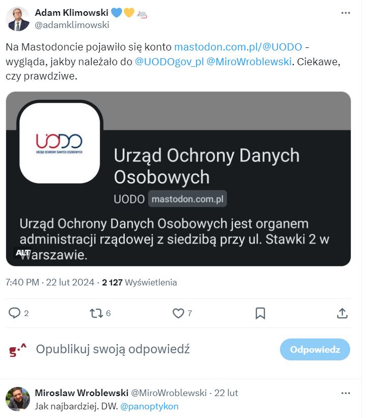 Może nie jesteśmy pierwsi na Mastodonie, ale też nie ostatni. Dzień po nas swoje konto założył Urząd Ochrony Danych Osobowych. Wywołał przy tym spore poruszenie co do autentyczności profilu, który przez jakiś czas nie był zweryfikowany, a pierwsze wpisy pojawiły się na nim dopiero kilka dni później. By sprawdzić, czy profil jest autentyczny, niektórzy pytali o to prezesa UODO Mirosława Wróblewskiego na portalu X, inni składali w tej sprawie wnioski o informację publiczną.