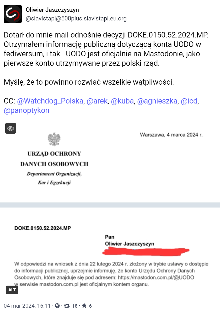 Wątpliwości rozwiał w końcu sam Urząd Ochrony Danych Osobowych, publikując swój pierwszy wpis na Mastodonie, a także informując na swojej stronie i pozostałych mediach społecznościowych, że: