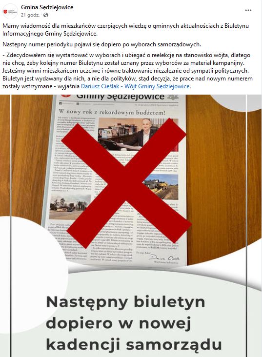 Odnotować też należy stanowisko Wójta Gminy Sędziejowice, który w okresie wyborczym postanowił nie wydawać lokalnego biuletynu.