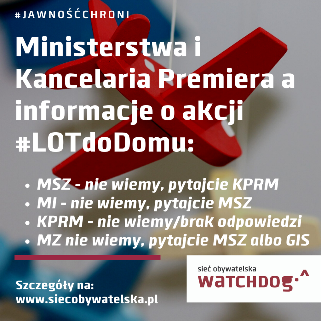 Niepokojąca jest sytuacja, w której Kancelaria Premiera nie dysponuje wnioskowanymi informacjami na zmianę z ignorowaniem kierowanych do niej pytań, ministerstwa gubią się w tym, kto jest odpowiedzialny za akcję #LOTdoDomu, a LOT plącze się w rozdwojeniu, które można streścić jako nie jesteśmy podmiotem zobowiązanym, niezależnie od powyższego coś odpowiemy, bo sąd może uważać inaczej. Jak ma zorientować się w tym wszystkim obywatel? To pytanie zostawiamy Wam, a my czekamy na ewentualne kolejne odpowiedzi na nasze wnioski i wyniki postępowań sądowych wobec LOT i KPRM.