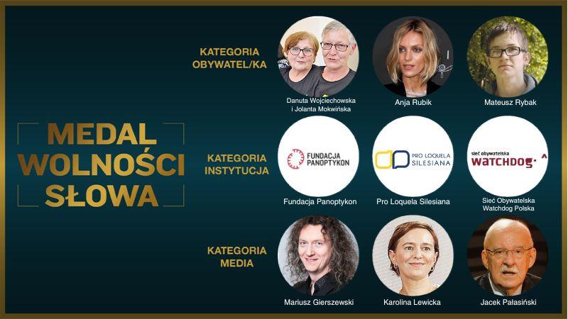 Fundacja Grand Press przedstawiła tegoroczne kandydatki i kandydatów do Medalu Wolności Słowa, wskazanych przez kapitułę konkursu, w której składzie znajdują się Krzysztof Głuchowski (dyrektor Teatru im. J. Słowackiego w Krakowie), prof. Ewa Łętowska (była rzeczniczka praw obywatelskich), Weronika Mirowska (prezeska Fundacji Grand Press), Piotr Świerczek (dziennikarz TVN 24) oraz Ewa Wrzosek (prokuratorka, Stowarzyszenie Prokuratorów „Lex super omnia”). Wśród nominowanych w kategorii instytucja wskazana została, obok Fundacji Panoptykon i Towarzystwa Pro Loquela Silesiana, Sieć Obywatelska Watchdog Polska.