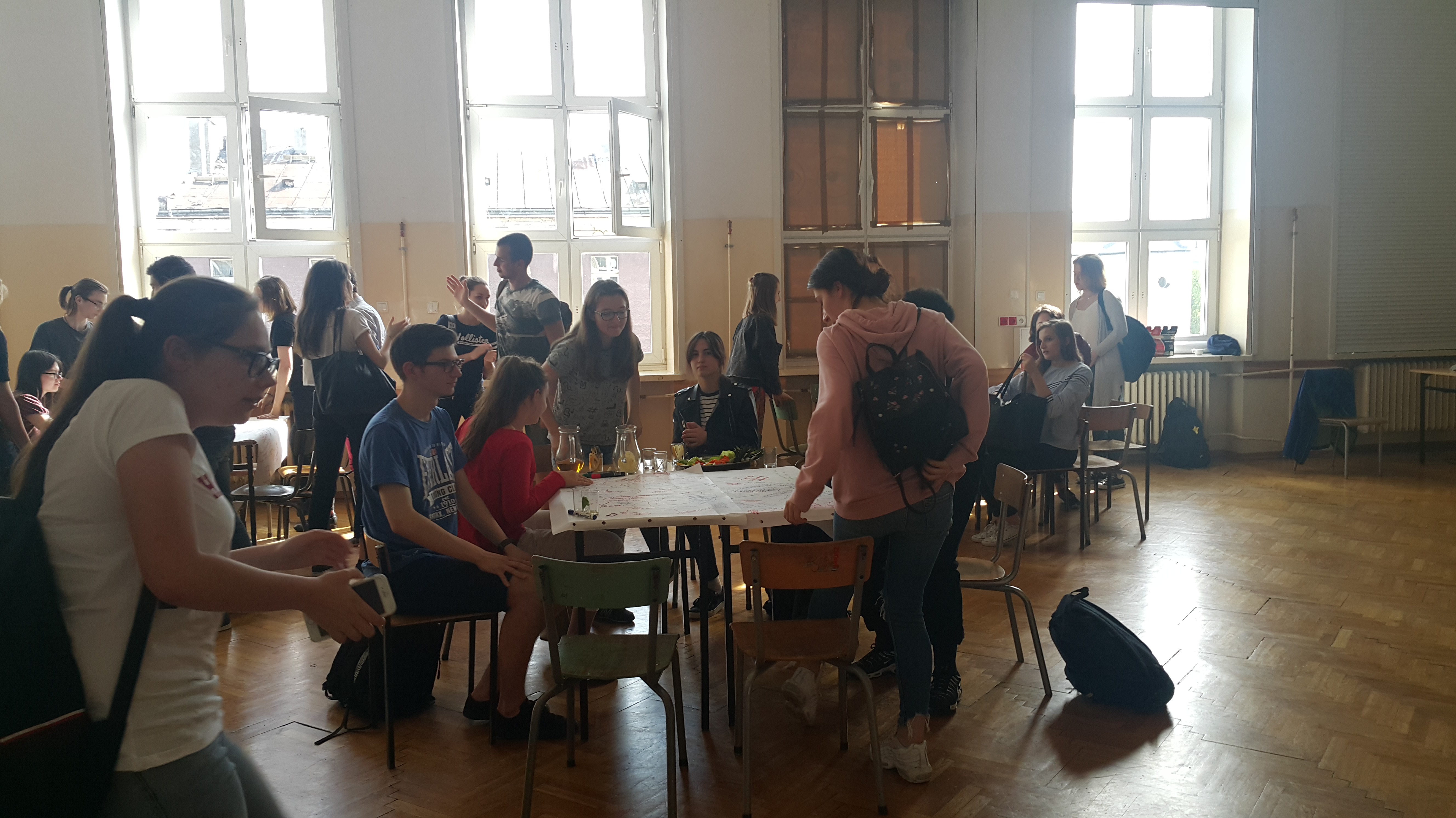W szkole przywitała nas grupa około 40 osób z dwóch klas pierwszych; biologiczno-chemicznej i humanistycznej. Podczas spotkania pracowaliśmy metodą world cafe (więcej o metodzie) wokół 5 tematycznych obszarów – wizja przyszłości w Polsce, stosunek do polityki, wartości w polityce i życiu, korzystanie z praw oraz sposoby korzystania z mediów.