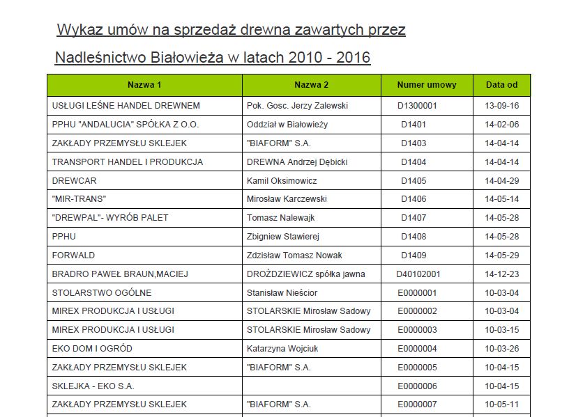 - informacji o zawartych umowach na sprzedaż drewna w okresie od 1 stycznia 2010 do 3 marca 2016 r. poprzez podanie informacji o stronach poszczególnych umów, kwotach, na jakie te umowy opiewały, przedmiocie tychże umów, ewentualnie zaś o dacie ich zawarcia,