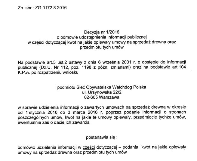 Jednocześnie w zakresie udostępnienia szczegółowych informacji o zawartych umowach Nadleśnictwo wydało decyzję odmowną.