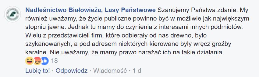 Po udostępnieniu tej informacji na naszym profilu facebook’owym Nadleśnictwo Białowieża skomentowało, że jedną z przyczyn odmowy udostępnienia nam informacji była kwestia bezpieczeństwa nabywców drewna.