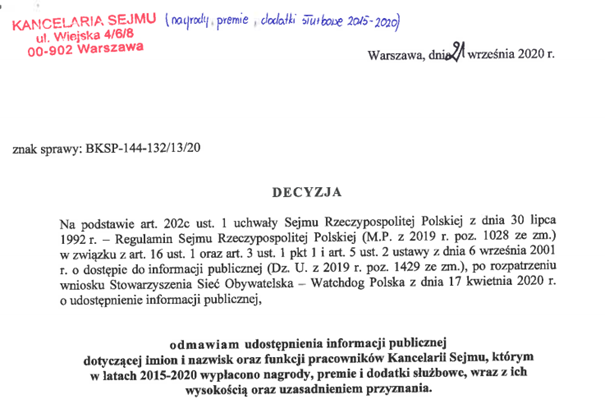 Kluczowe dla oceny wypłacanych nagród i premii ma wnioskowana przez nas informacja o tym, komu (z imienia i nazwiska), ile i za co wypłacono dodatkowego wynagrodzenia. Jednakże w tym wypadku obie Izby postąpiły identycznie. Odmówiły udostępnienia tych informacji i wydały decyzje odmowne.