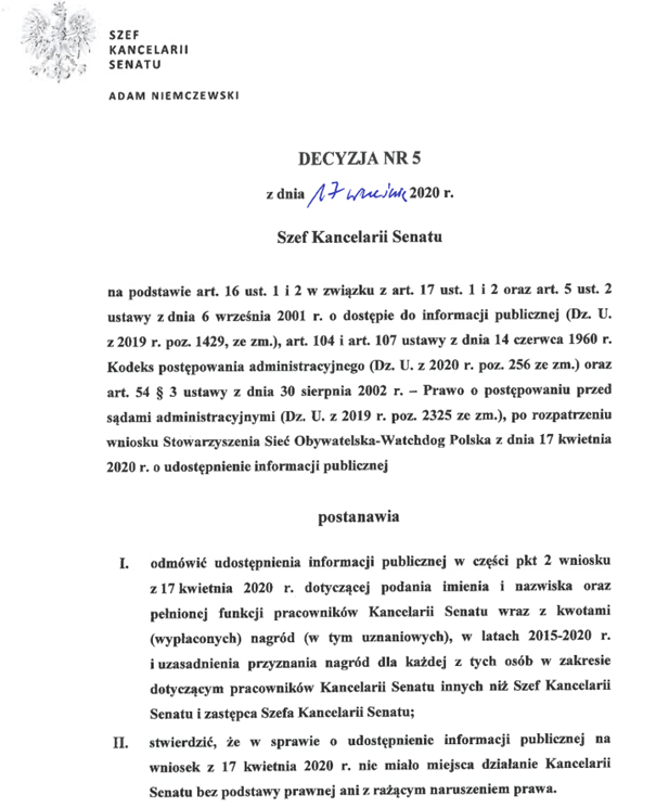 Nim Kancelaria Senatu wydała decyzję odmowną, zaskarżyliśmy jej bezczynność, ponieważ nie odniosła się do wszystkich naszych pytań. Wyrokiem z 1 grudnia 2020 r. Wojewódzki Sąd Administracyjny uznał, że doszło do bezczynności w dniu złożenia skargi. Szkoda, że do realizacji wniosku o informację przez obie kancelarie konieczne jest złożenie skargi. My jesteśmy do tego przyzwyczajeni, co nie jest budujące, ale osobę, która nie korzysta z prawa do informacji na co dzień, takie działania zniechęcają do zadawania pytań. Może o to władzy chodzi?