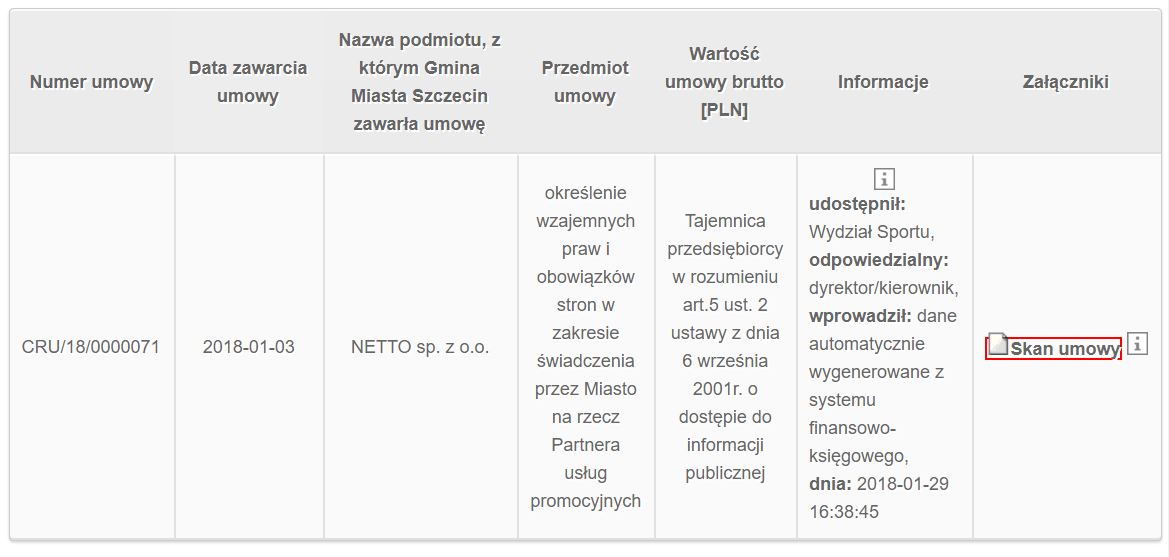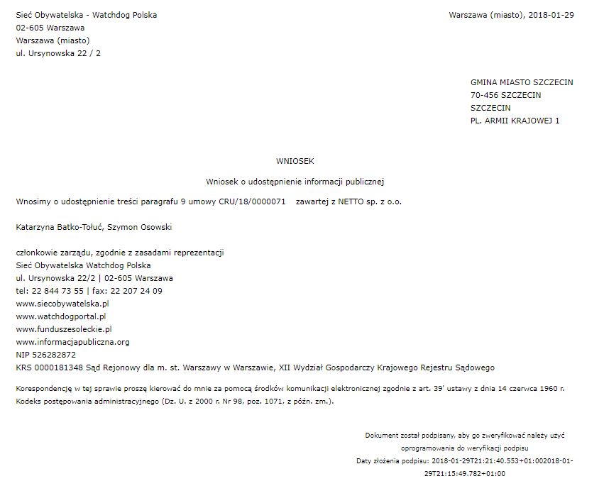 26 stycznia 2018 r. dostaliśmy odpowiedź, w której poinformowano nas, że skan umowy z firmą Netto został umieszczony w Biuletynie Informacji Publicznej Szczecina, nam przesłano jej załączniki.