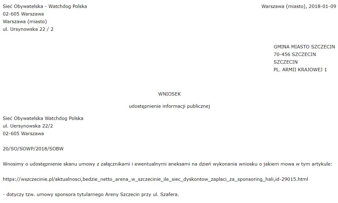 9 stycznia 2018 r. złożyliśmy do Urzędu Miasta Szczecina następujący wniosek o dostęp od informacji publicznej: