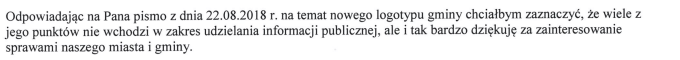Burmistrz uprzejmie podziękował za zainteresowanie sprawami gminy, zaznaczając, że wiele z punktów wniosku nie dotyczy informacji publicznej. Tymczasem wątpliwe są tu jedynie pytania dotyczące opinii burmistrza na temat nowego logotypu, wszystkie pozostałe jak najbardziej dotyczą sfery działania urzędu i burmistrz powinien na nie odpowiedzieć.