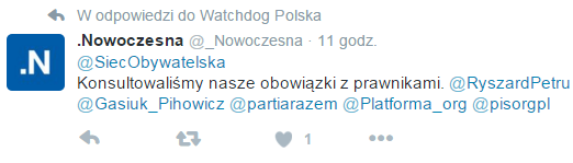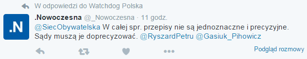 Nie chcieliśmy iść z tym do sądu i czekaliśmy na wykonanie wniosku w wydłużonym przez partię terminie do dnia 25 stycznia 2016 r. Nie rozumiemy, z czego wynika brak konsekwencji w kwestii jawności i otwartości. Teraz rozważamy zawiadomienie o możliwości popełnienia przestępstwa przez partię Nowoczesna.