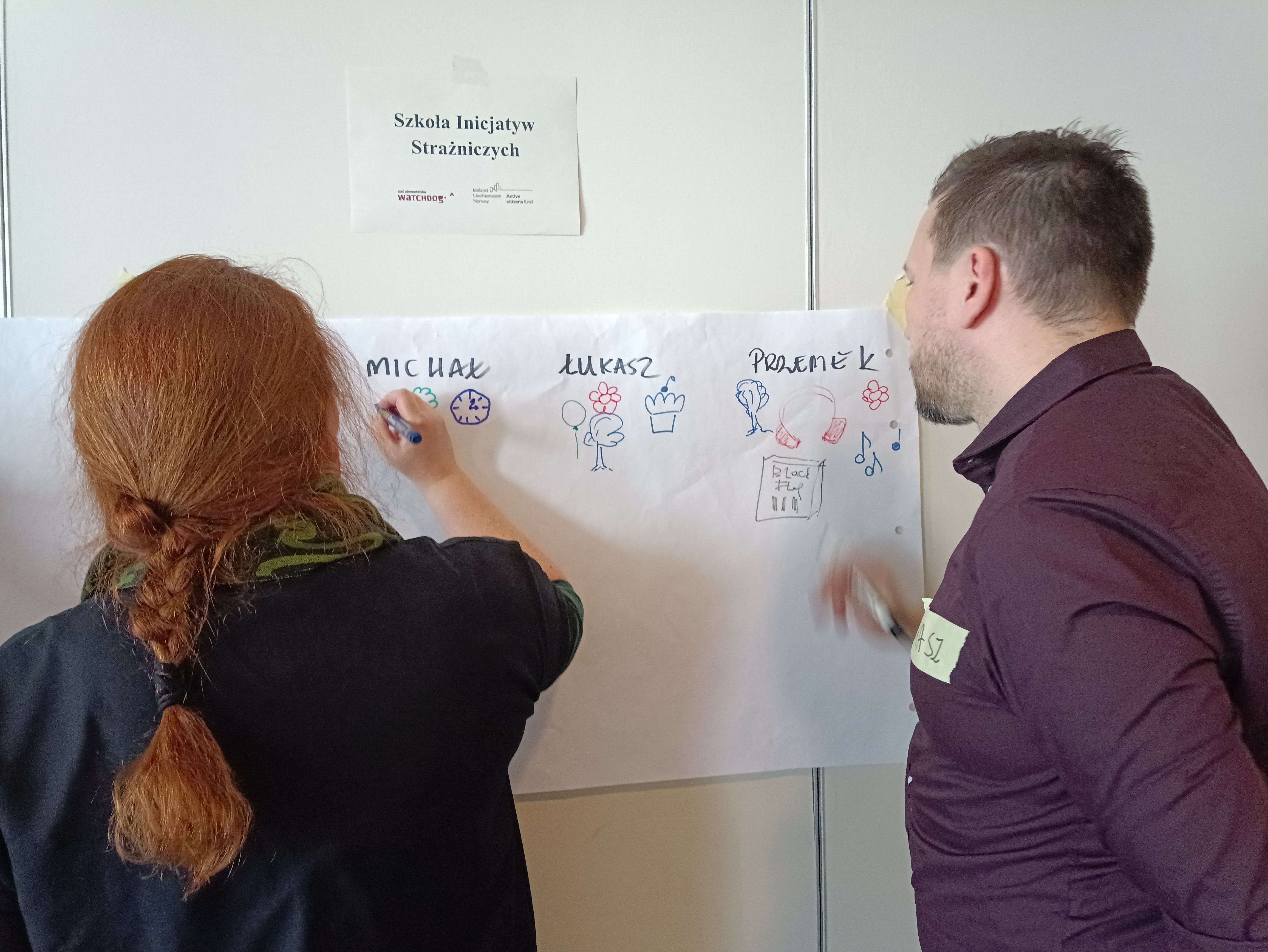 Praktyczna część warsztatu dała uczestnikom pole do popisu – zadaniem dla każdej z grup było zaplanowanie happeningu mającego zwrócić uwagę na zagadnienie, które monitorują. Świetnych pomysłów było wiele i mamy nadzieję, że uda się je chociaż częściowo zrealizować.
