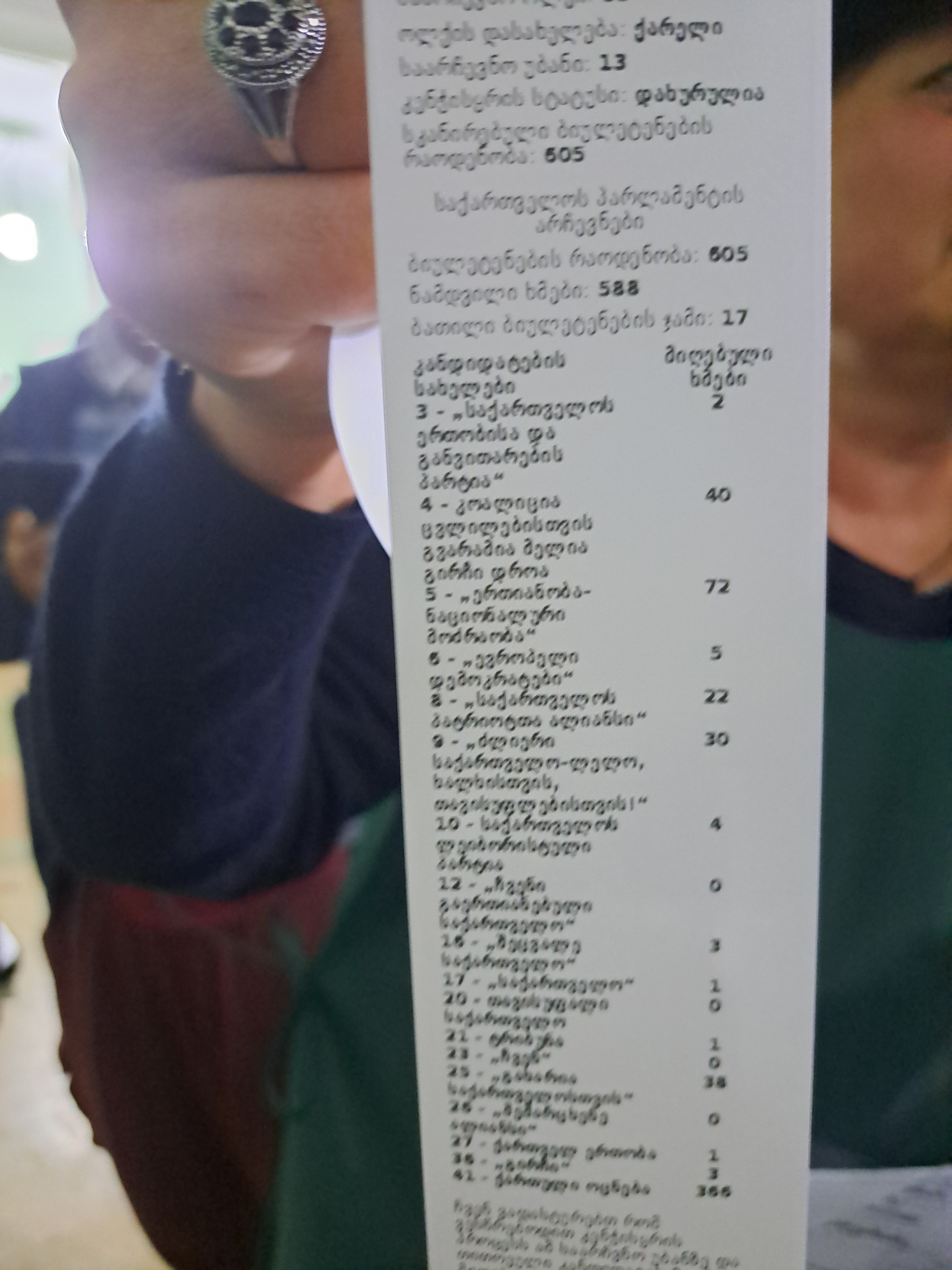 Obserwowaliśmy wybory w małych miejscowościach. Tym, co rzucało się w oczy, zwłaszcza w przedpołudniowym szczycie, były grupki mężczyzn stojących wokół lokali. Trudno nam ocenić, na ile to specyfika kulturowa, a na ile mieli kontrolować sytuację. W jednym wypadku zaobserwowaliśmy minibusa, w którym siedziało kilka dorosłych osób i trzymało jakieś papiery. Trochę jakby załatwiali jakieś sprawy administracyjne. Samochód stał, gdy wchodziliśmy na obserwację i gdy wychodziliśmy po kilkudziesięciu minutach. Wciąż siedziała w nim grupa dorosłych osób. Gdy mu się przyglądaliśmy, ktoś zdjął kartkę przyklejoną do przedniej szyby, ale potem kartka wróciła na swoje miejsce,Pod innym lokalem zaobserwowaliśmy głośną awanturę. Grupy mieszkańców wykrzykiwały do siebie. Mieliśmy wrażenie, że zaraz się pobiją. Wedle rozmów z obserwatorami z opozycji, przyczyną miało być kupowanie głosów. Jedna z osób zaczęła krzyczeć do innej “sprzedałeś kraj za 500 lari!”.