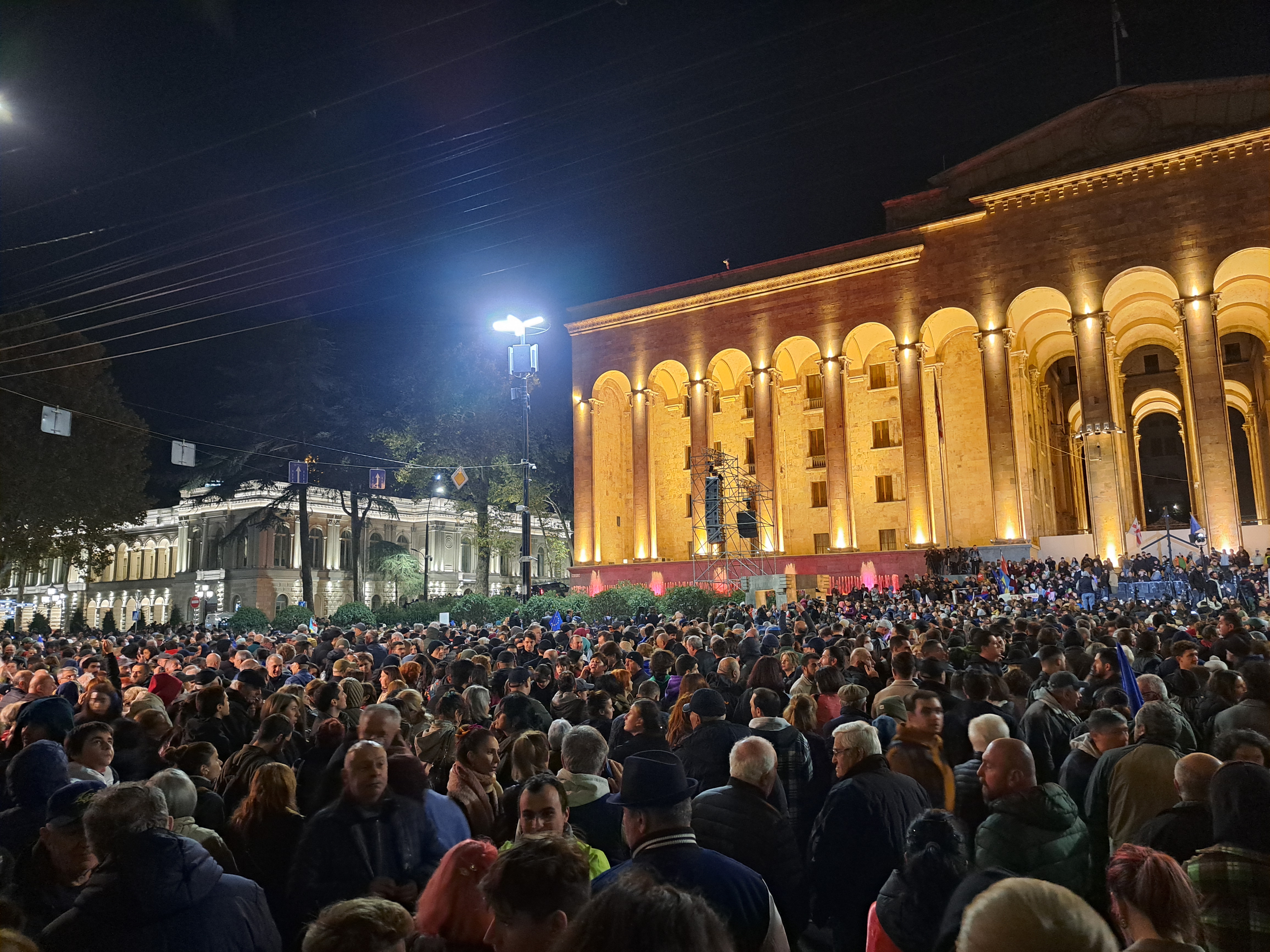 Na wezwanie prezydentki, Salome Zurabiszwili, w poniedziałek na ulice wyszły osoby, które chciały wyrazić swój sprzeciw wobec wyników wyborów. Demonstracja miała pokojowy charakter. Było dużo młodych osób. Powiewały flagi Gruzji i Unii Europejskiej. Prezydentka mówiła o “skradzionych głosach i o tym, że przysięga, że będzie z ludźmi do końca tej drogi, dopóki nie dotrzemy do bram Europy”