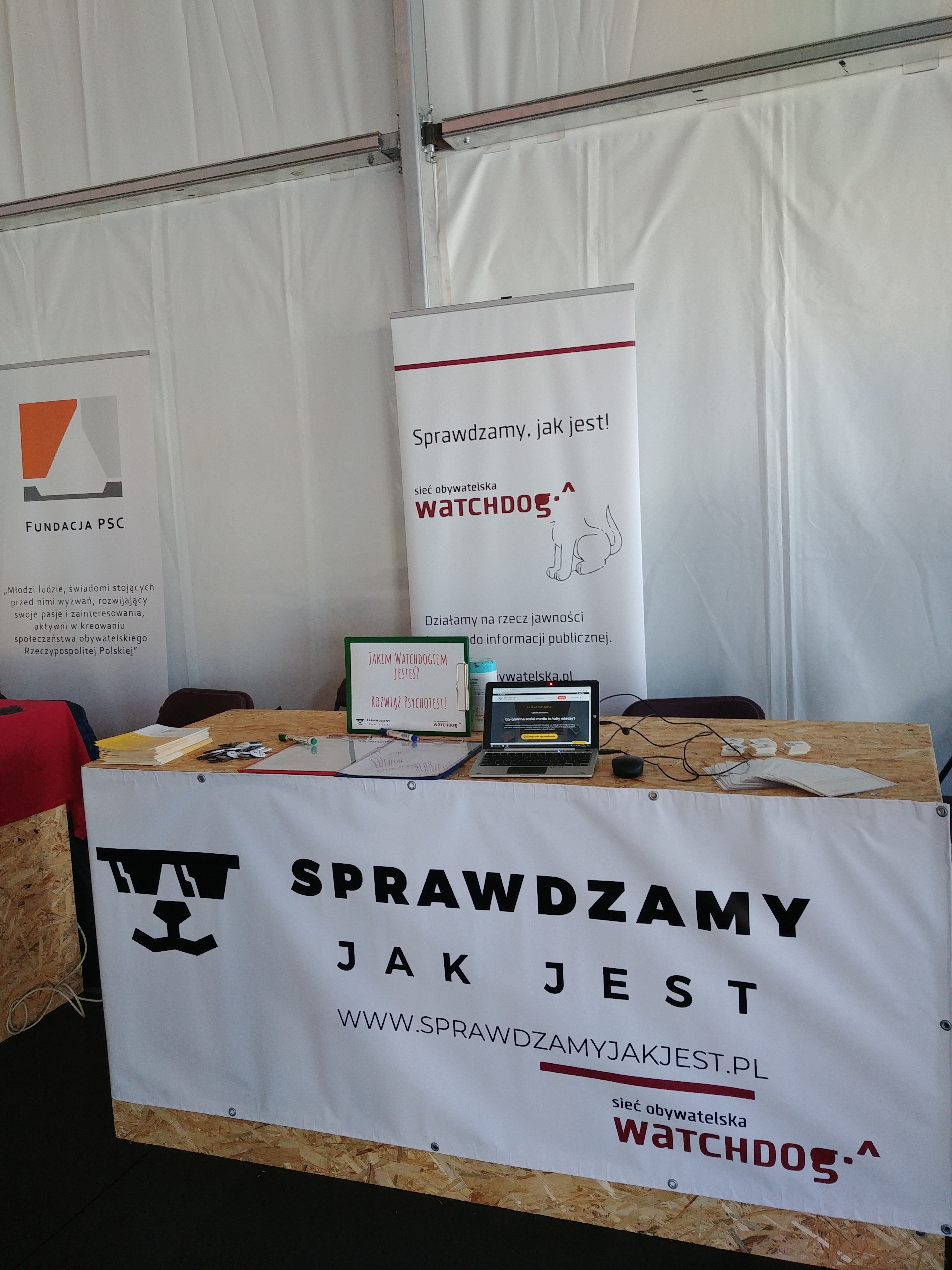 [Roksana] Nie bylibyśmy też sobą, gdybyśmy nie przygotowali mnóstwa aktywności. Wszystkiemu, co przywieźliśmy, przyświecało hasło ,,Sprawdzamy, jak jest”, bo chcieliśmy zachęcić festiwalowiczów do korzystania z naszego nowego serwisu, otwartego dla wszystkich dokładnie z rozpoczęciem festiwalu, ale też ,,zarazić” watchdogową postawą ,,sprawdzania, jak jest”. Oprócz możliwości sprawdzenia dokumentów na www.sprawdzamyjakjest.pl, na naszym stoisku czekała: wspomniana przez Paulę tablica z przykładami informacji publicznej, miejsce do zagłosowania na kolejne tematy monitoringów w ,,Sprawdzamy…”, psychotest, który pomagał odkryć w sobie żyłkę watchdoga, przestrzeń do twórczej wypowiedzi o jakości otaczających nas przekazów medialnych i informacji oraz zagadki dotyczące informacji publicznej. Nie zabrało też zmywalnych tatuaży z psiakami ze ,,Sprawdzamy” i przypinek.