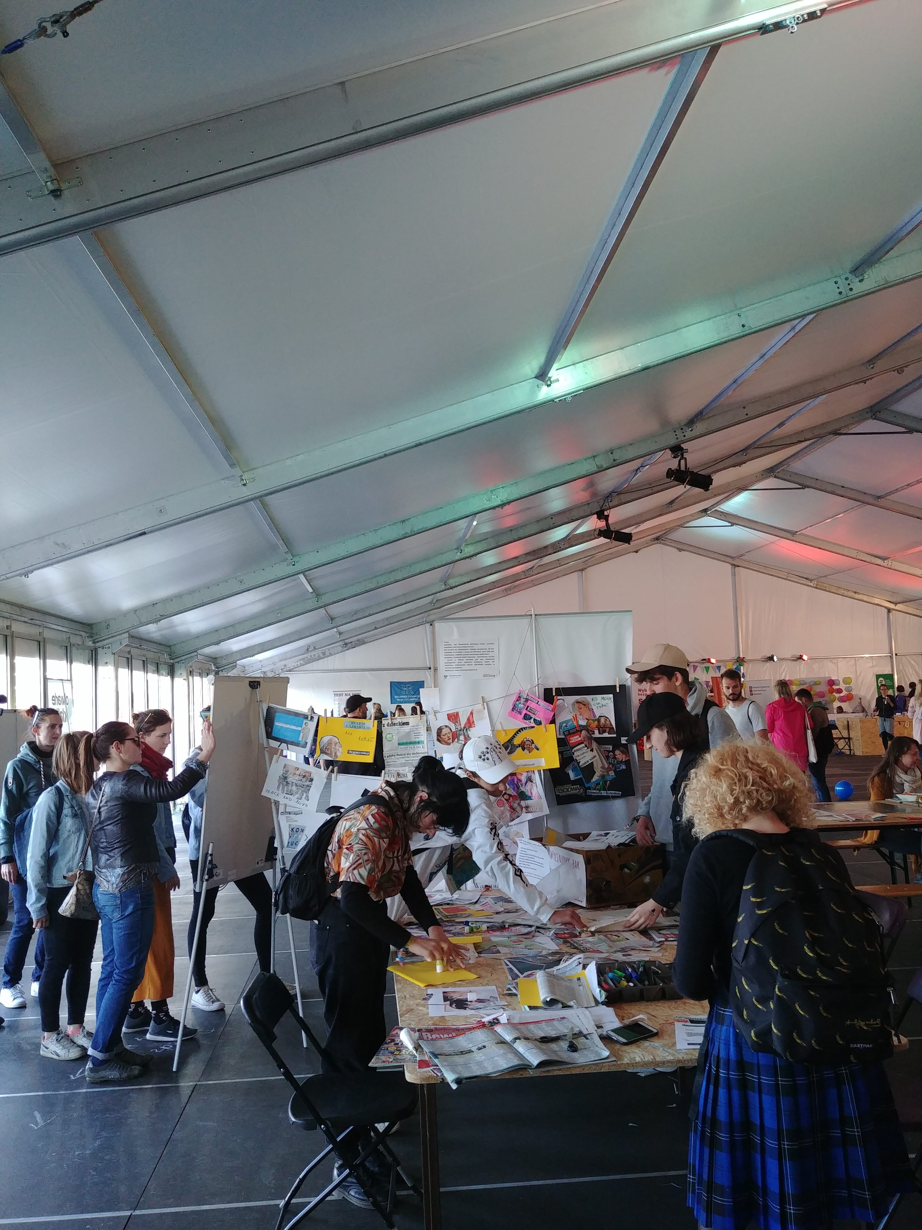 Kiedy lunął deszcz, strefa NGO zaczęła przypominać lotnisko, z którego odwołano wszystkie połączenia. Paskudna aura miała swoje zalety – przemoknięci openerowicze tłumnie brali udział w aktywnościach, tworzyli przemyślane ziny, przychodzili pogawędzić i chociaż miałam wrażenie, że wielu chce się po prostu ogrzać, przynieśli ze sobą mnóstwo energii i nowych pomysłów.