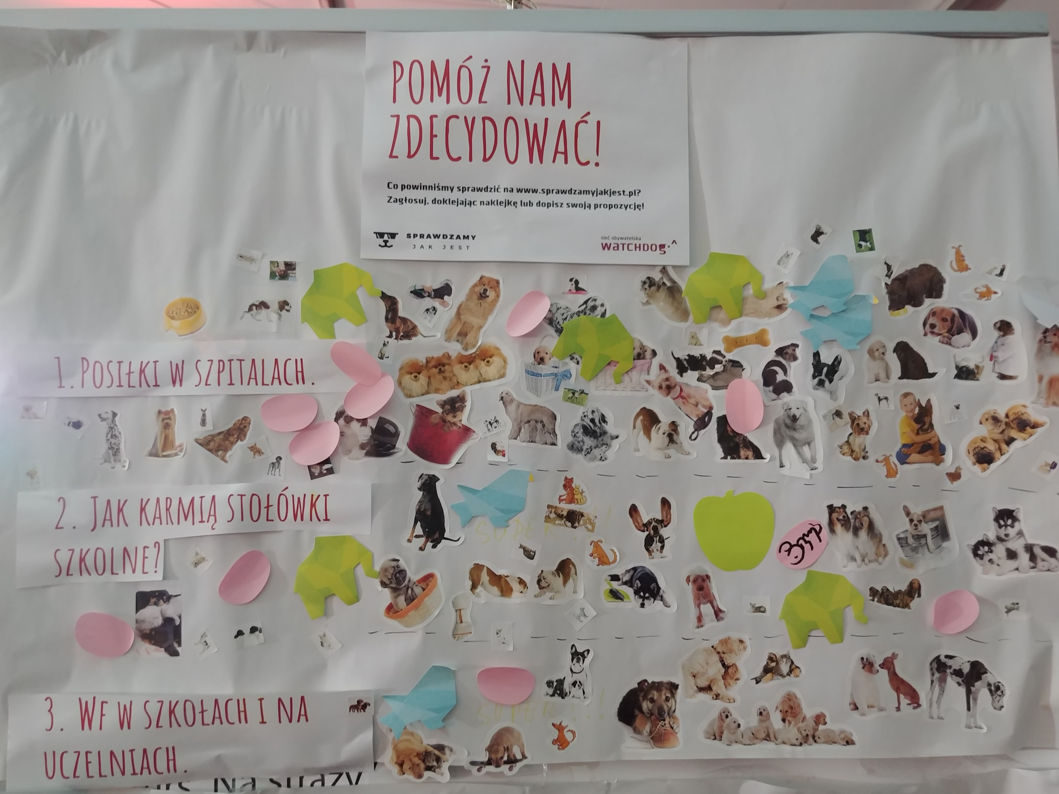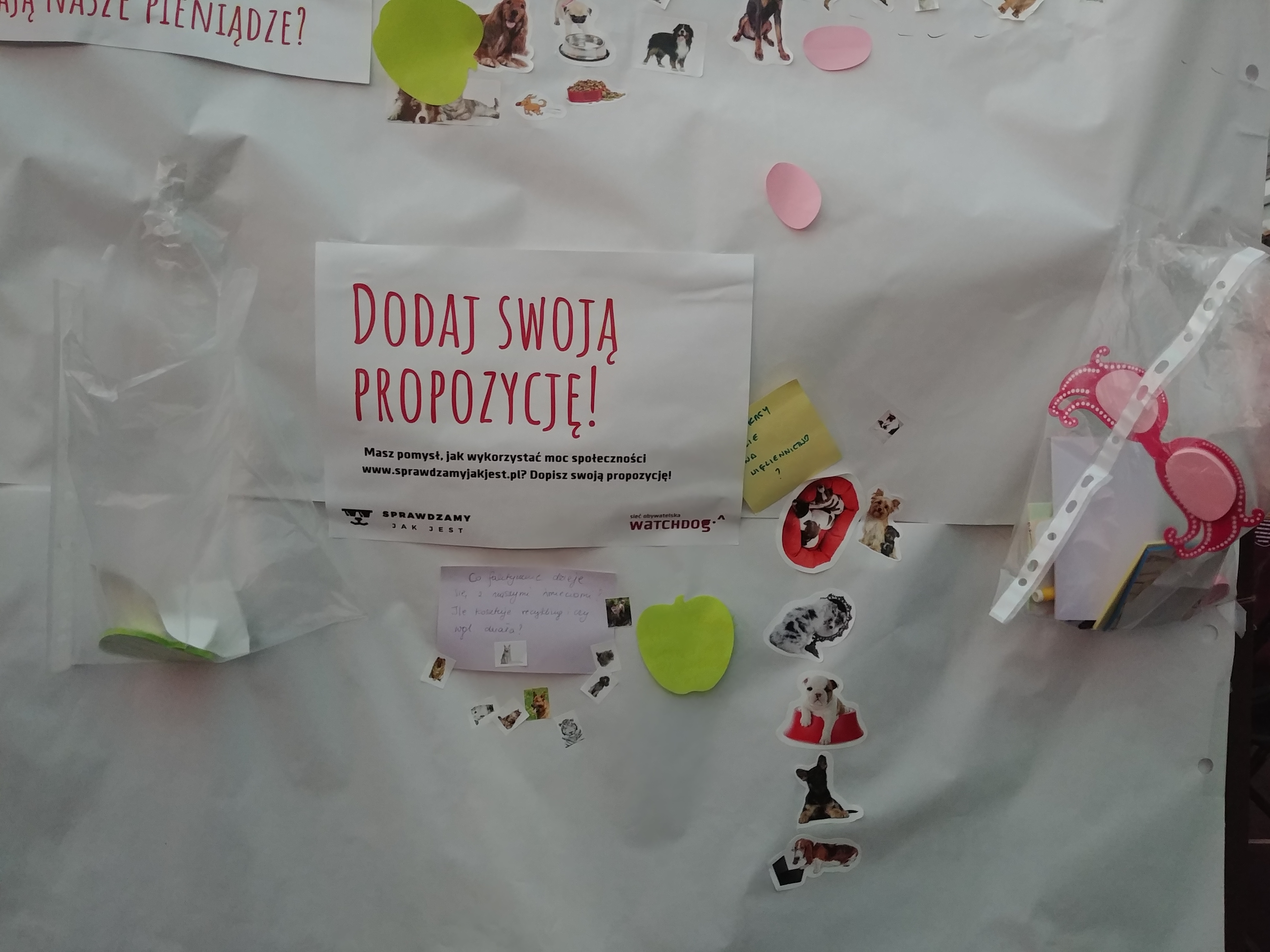 [Roksana] Nie bylibyśmy też sobą, gdybyśmy nie przygotowali mnóstwa aktywności. Wszystkiemu, co przywieźliśmy, przyświecało hasło ,,Sprawdzamy, jak jest”, bo chcieliśmy zachęcić festiwalowiczów do korzystania z naszego nowego serwisu, otwartego dla wszystkich dokładnie z rozpoczęciem festiwalu, ale też ,,zarazić” watchdogową postawą ,,sprawdzania, jak jest”. Oprócz możliwości sprawdzenia dokumentów na www.sprawdzamyjakjest.pl, na naszym stoisku czekała: wspomniana przez Paulę tablica z przykładami informacji publicznej, miejsce do zagłosowania na kolejne tematy monitoringów w ,,Sprawdzamy…”, psychotest, który pomagał odkryć w sobie żyłkę watchdoga, przestrzeń do twórczej wypowiedzi o jakości otaczających nas przekazów medialnych i informacji oraz zagadki dotyczące informacji publicznej. Nie zabrało też zmywalnych tatuaży z psiakami ze ,,Sprawdzamy” i przypinek.