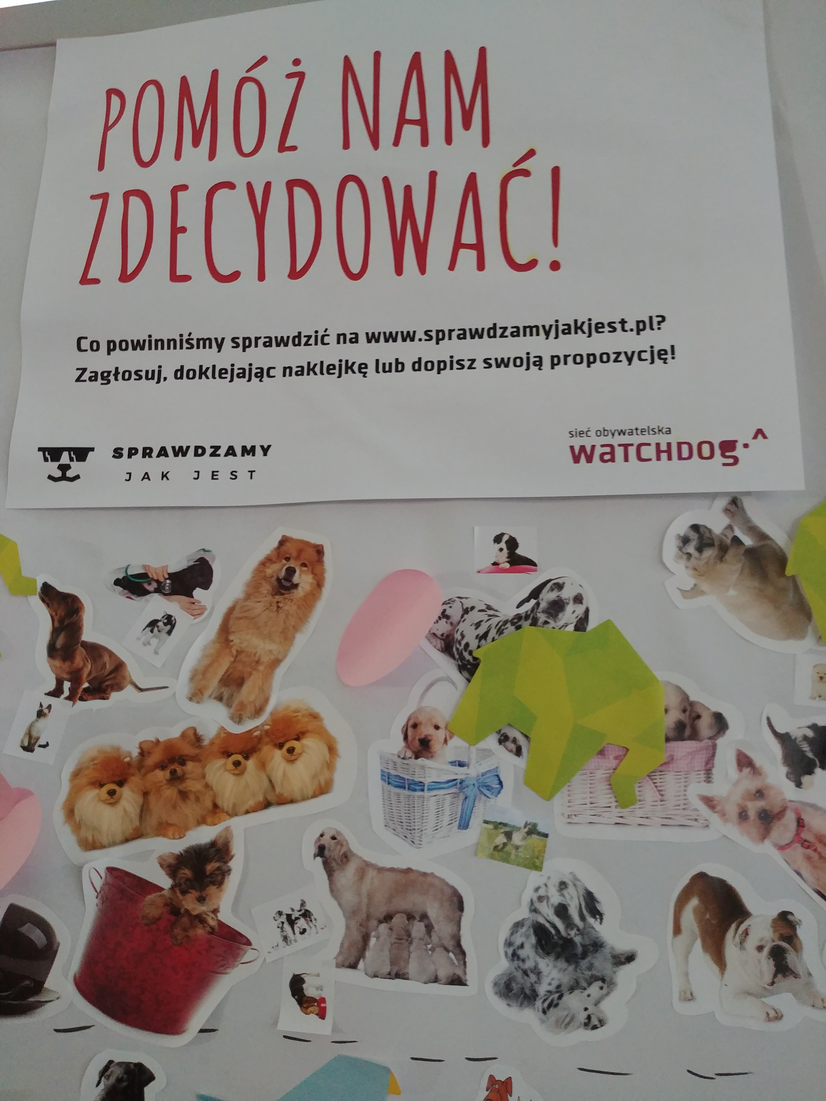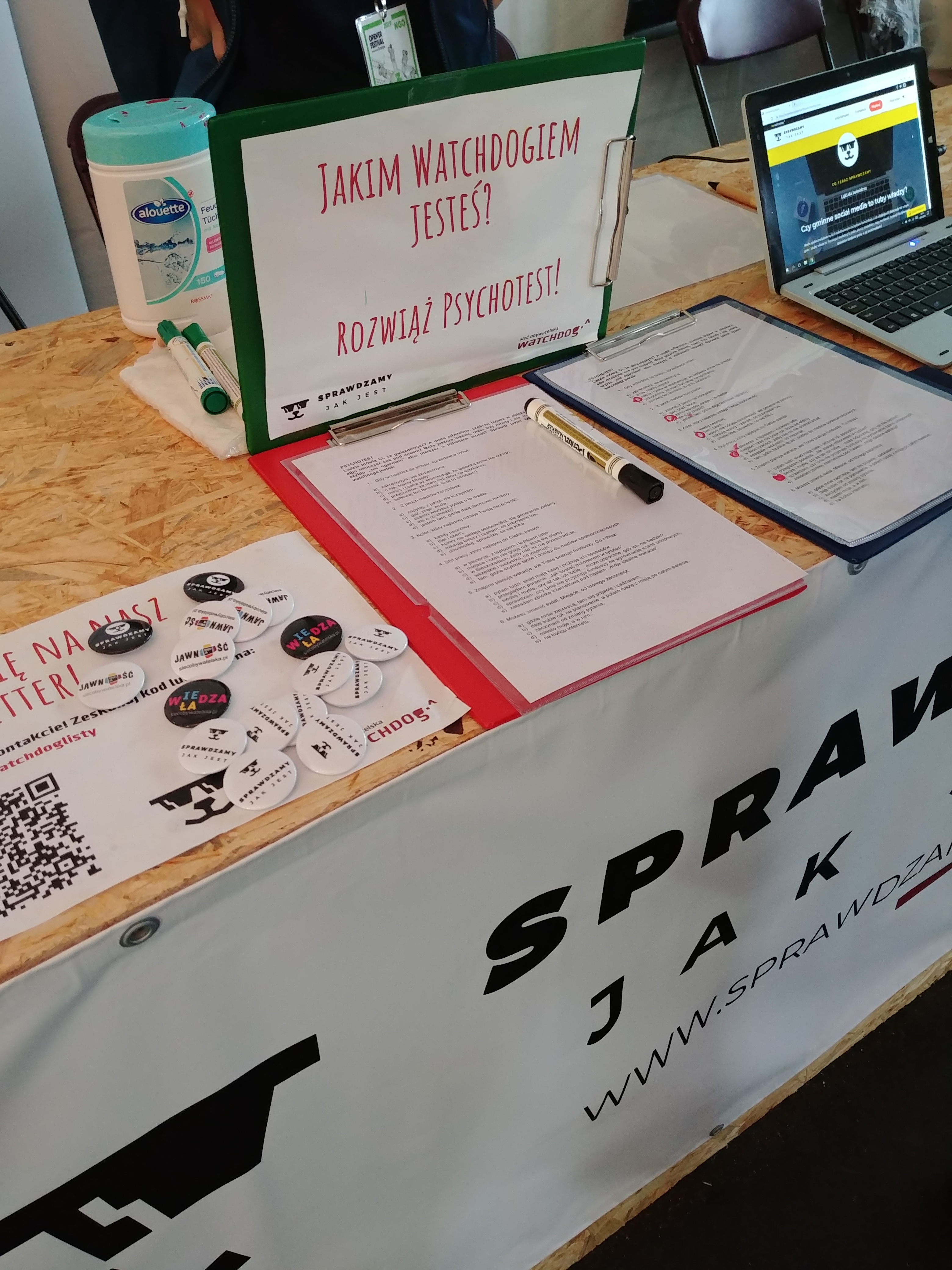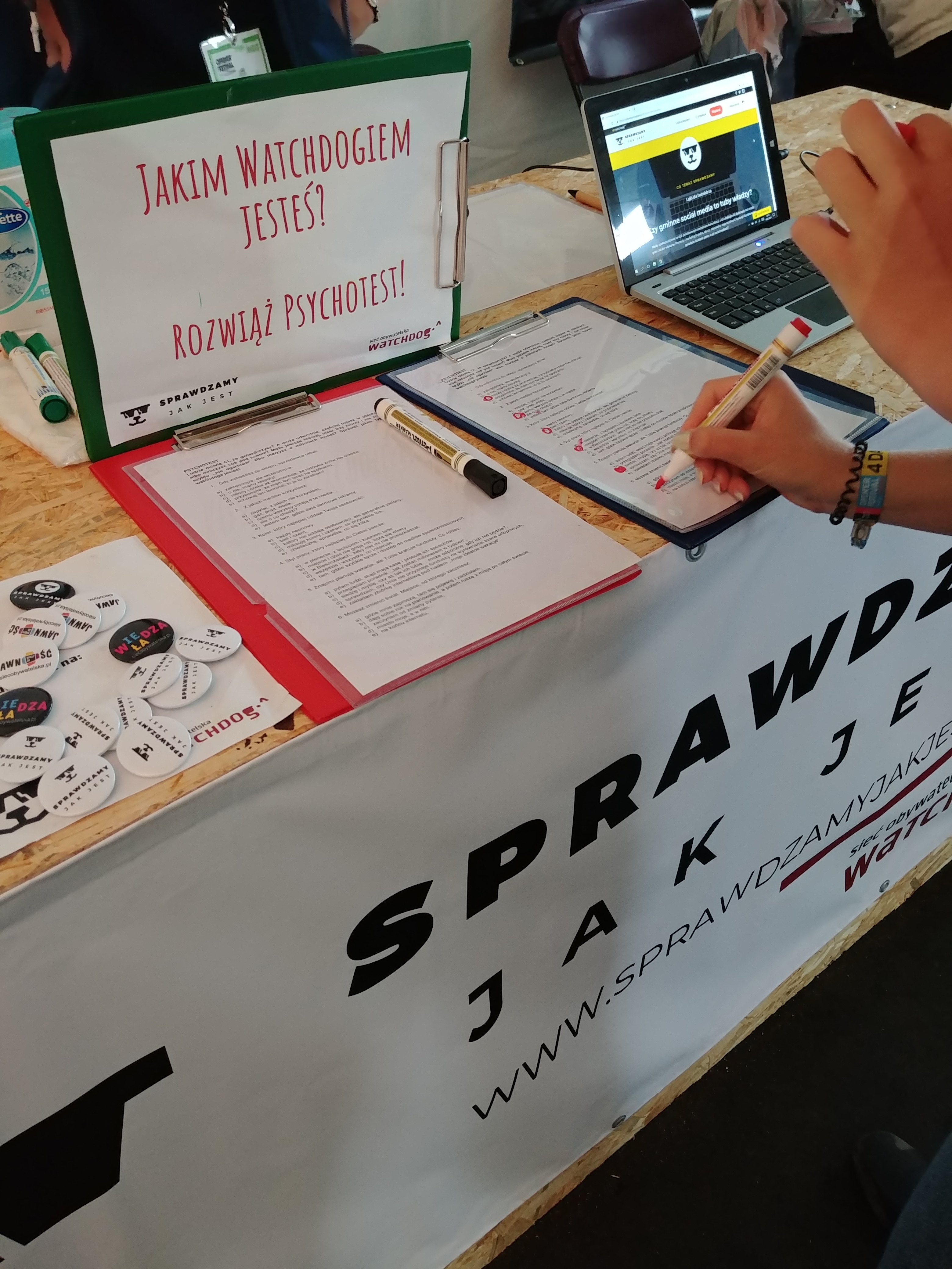 [Roksana] Nie bylibyśmy też sobą, gdybyśmy nie przygotowali mnóstwa aktywności. Wszystkiemu, co przywieźliśmy, przyświecało hasło ,,Sprawdzamy, jak jest”, bo chcieliśmy zachęcić festiwalowiczów do korzystania z naszego nowego serwisu, otwartego dla wszystkich dokładnie z rozpoczęciem festiwalu, ale też ,,zarazić” watchdogową postawą ,,sprawdzania, jak jest”. Oprócz możliwości sprawdzenia dokumentów na www.sprawdzamyjakjest.pl, na naszym stoisku czekała: wspomniana przez Paulę tablica z przykładami informacji publicznej, miejsce do zagłosowania na kolejne tematy monitoringów w ,,Sprawdzamy…”, psychotest, który pomagał odkryć w sobie żyłkę watchdoga, przestrzeń do twórczej wypowiedzi o jakości otaczających nas przekazów medialnych i informacji oraz zagadki dotyczące informacji publicznej. Nie zabrało też zmywalnych tatuaży z psiakami ze ,,Sprawdzamy” i przypinek.