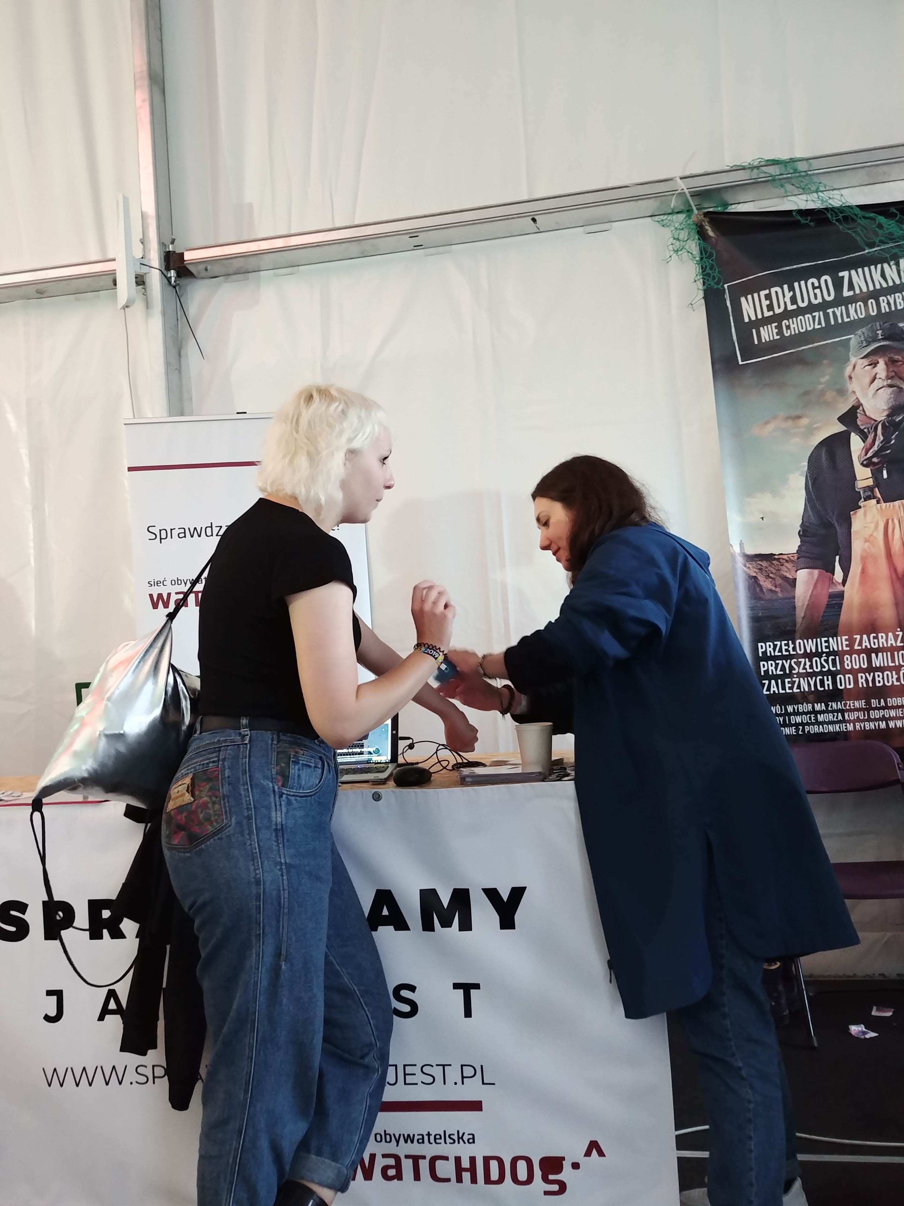 [Roksana] Jako weteranka naszych wyjazdów na Open’era (byłam na każdym z ostatnich trzech) wydawało mi się, że już doskonale wiem, czego się spodziewać. Tymczasem za każdym razem trafia do nas wiele osób, które pierwszy raz słyszą o nas i prawie do informacji publicznej! Widać, że festiwalowa publiczność co roku mocno się wymienia. To świetne, bo trafiamy wciąż do nowych ludzi. Z drugiej strony strasznie miłe były komentarze ludzi, którzy wskazywali nasze stoisko znajomym i mówili ,,o, jest Watchdog, świetną robotę robią”. Podobało mi się, że nawet głosowanie na tematy kolejnych monitoringów, wymagające większego skupienia i zrozumienia tego, czym się zajmujemy, cieszyło się dużą popularnością.