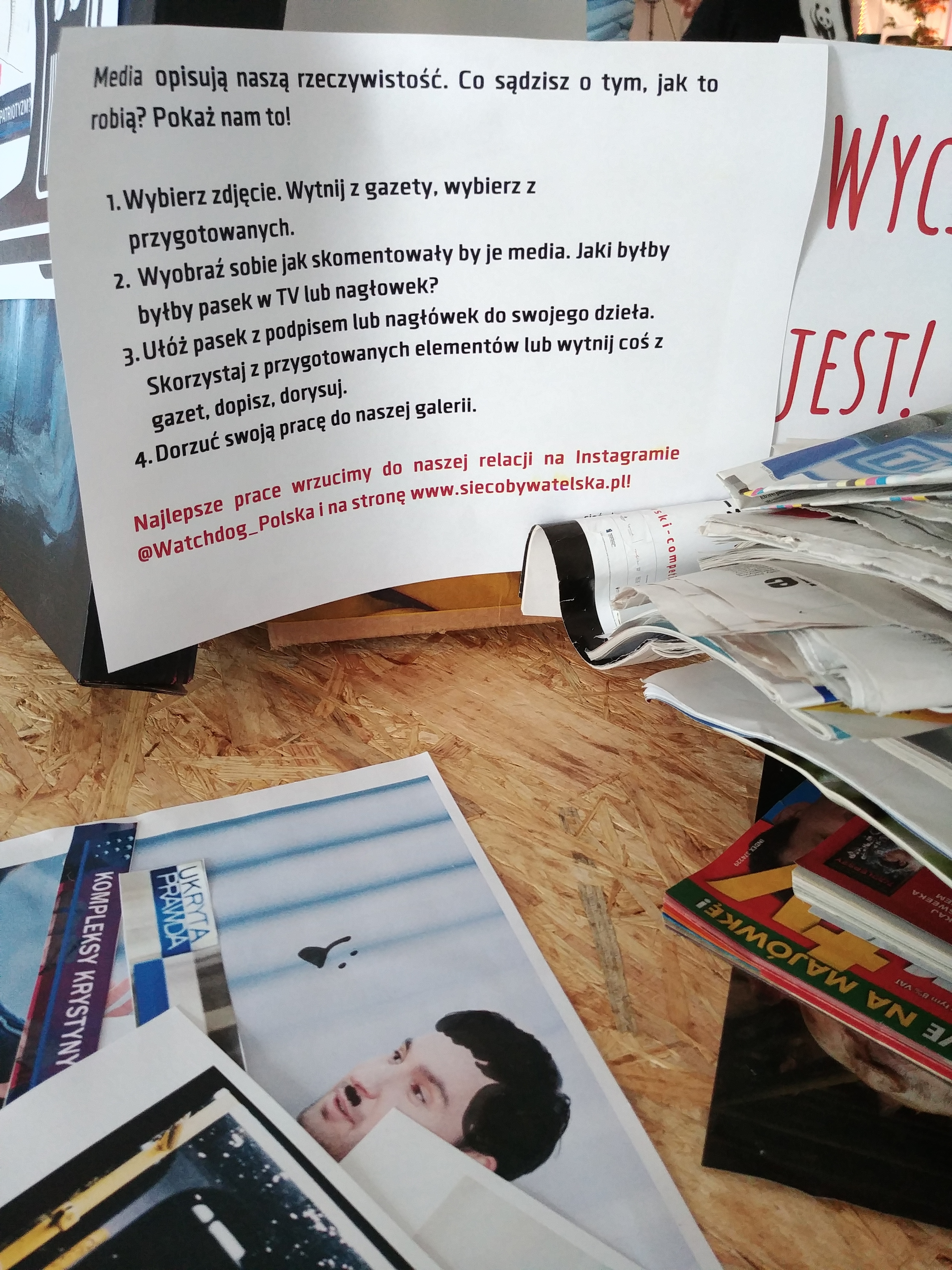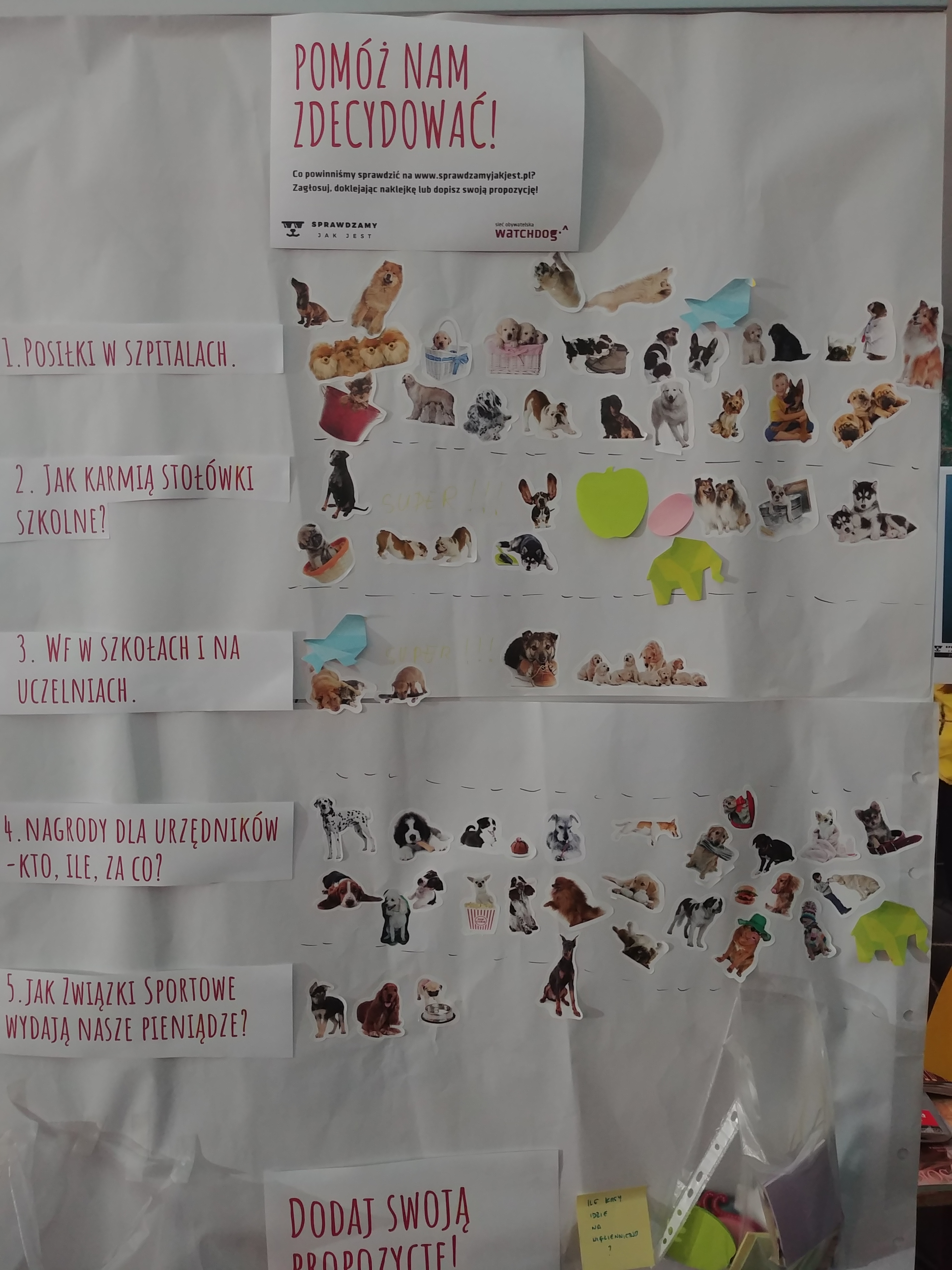 [Roksana] Nie bylibyśmy też sobą, gdybyśmy nie przygotowali mnóstwa aktywności. Wszystkiemu, co przywieźliśmy, przyświecało hasło ,,Sprawdzamy, jak jest”, bo chcieliśmy zachęcić festiwalowiczów do korzystania z naszego nowego serwisu, otwartego dla wszystkich dokładnie z rozpoczęciem festiwalu, ale też ,,zarazić” watchdogową postawą ,,sprawdzania, jak jest”. Oprócz możliwości sprawdzenia dokumentów na www.sprawdzamyjakjest.pl, na naszym stoisku czekała: wspomniana przez Paulę tablica z przykładami informacji publicznej, miejsce do zagłosowania na kolejne tematy monitoringów w ,,Sprawdzamy…”, psychotest, który pomagał odkryć w sobie żyłkę watchdoga, przestrzeń do twórczej wypowiedzi o jakości otaczających nas przekazów medialnych i informacji oraz zagadki dotyczące informacji publicznej. Nie zabrało też zmywalnych tatuaży z psiakami ze ,,Sprawdzamy” i przypinek.