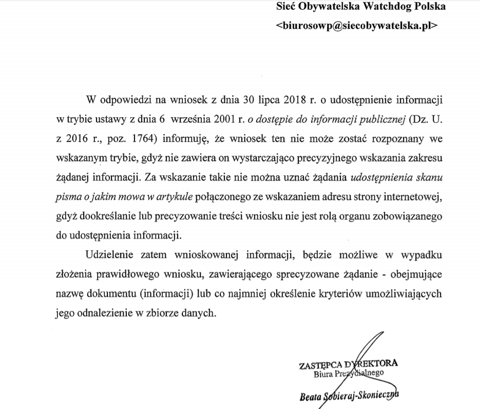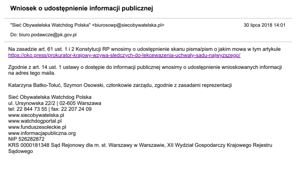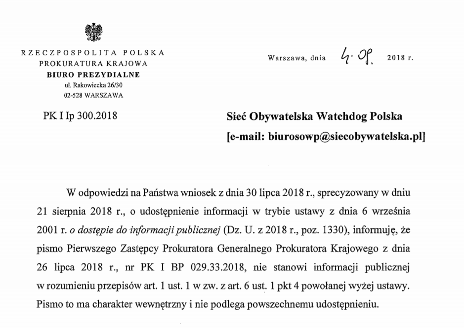 Wnioskiem z 30 lipca 2018 r. zwróciliśmy się do Prokuratury Krajowej o udostępnienie pisma, które zawierało wspomniane polecenie służbowe, ale w odpowiedzi Prokuratura wskazała, że nie może go rozpatrzeć, bo nie określiliśmy precyzyjnie dokumentu, o który nam chodzi. Po doprecyzowaniu, że nasz wniosek dotyczył pisma PK I BP 029.33.2018 Prokuratora Krajowa, odpowiadając ostatecznie na nasz wniosek 4 września 2018 r. wskazała, że wnioskowany dokument ma charakter wewnętrzny i nie podlega powszechnemu udostępnieniu.