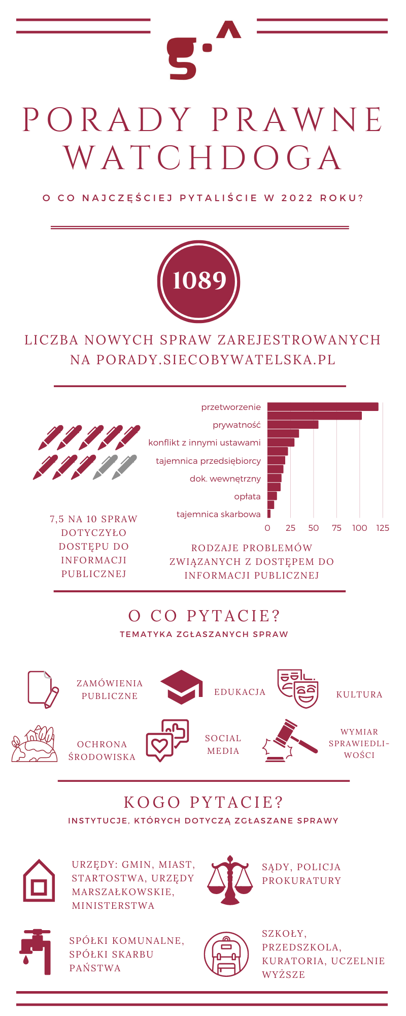 Staramy się Wam pomagać nie tylko poprzez poradnię prawną. Odpowiadamy na Wasze pytania w social mediach czy komunikatorach, a nasi prawnicy konsultują i przygotowują też treści edukacyjne na stronę informacjapubliczna.org i media społecznościowe, gdzie w ubiegłym roku pojawiły się serie wpisów oznaczonych hasztagami: #prawasądoużywania, #udipdokawy, #BIPwpytaniach czy rozpoczęta w 2022, a kontynuowana w 2023 roku seria #SłowniczekPrawnyWatchdoga. Wszystkie można znaleźć na FB i Instagramie, wpisując w wyszukiwarkę odpowiednią frazę.