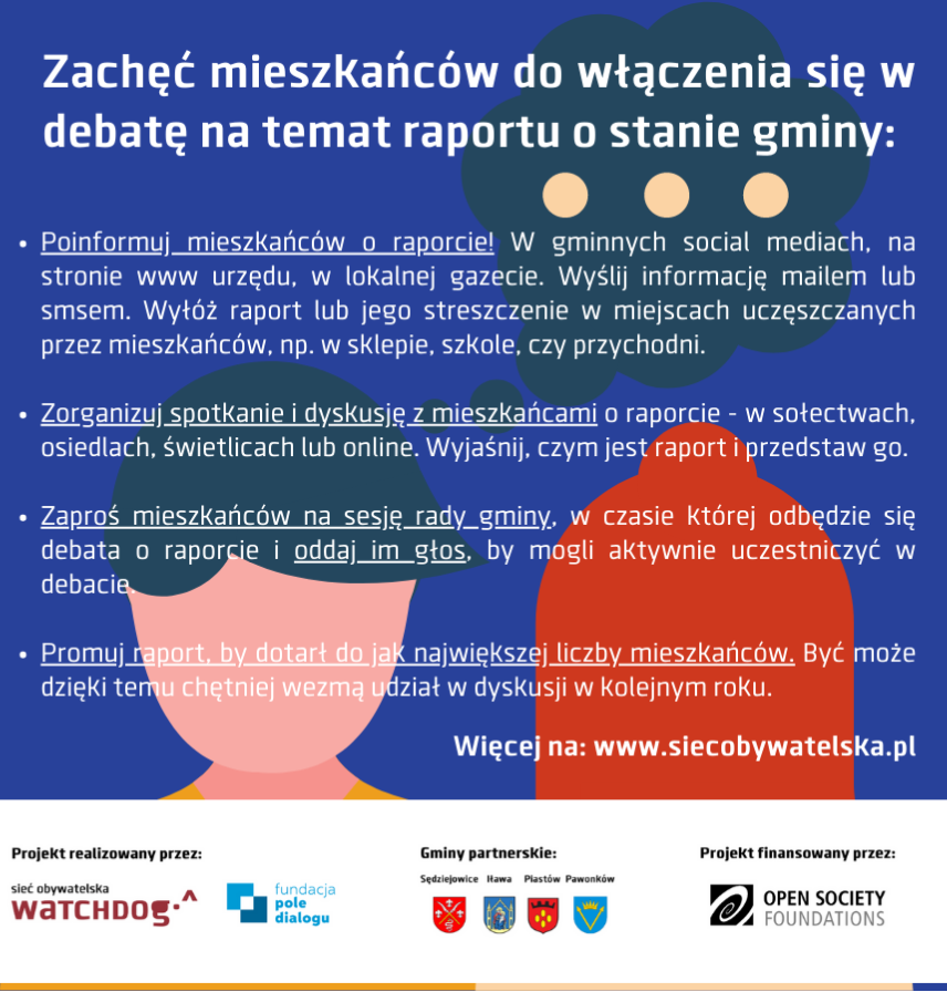 Bywa oczywiście tak, że urzędy “ukrywają” zaproszenia na debatą w dalekich zakładkach na BIPie, często jednak, mimo kampanii informacyjnej, nikt na taką sesję nie przychodzi. Dlatego wspólnie z Fundacją Pole Dialogu postanowiliśmy wesprzeć gminy w skutecznym angażowaniu mieszkańców w debatę o raporcie o stanie gminy, realizując program pn.Raport o stanie gminy – kolejny obowiązek czy narzędzie dla mieszkańców i władz? Naszymi partnerami w projekcie są 4 gminy – Iława, Pawonków, Piastów i Sędziejowice, a w drodze konkursu wyłoniliśmy jeszcze 12 gmin. Projekt to nie tylko szkolenia z angażowania mieszkańców czy konsultacje z ekspertami, ale także sieciowanie gmin, którym zależy na włączeniu mieszkańców w proces tworzenia raportu.
