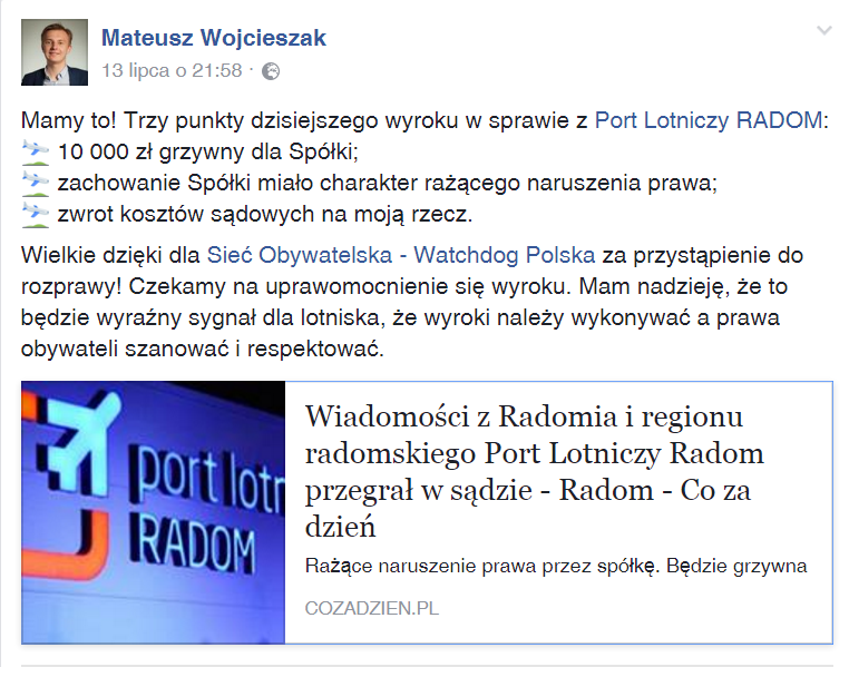Oprócz prośby o udostępnienie informacji, jakie rejestry są prowadzone przez spółkę, wniosek zawierał kilka szczegółowych pytań odnoszących się do tych rejestrów, ewidencji i systemów. Na to pytanie spółka odpowiedziała, że informacje te nie mają charakteru publicznych. Pojawiło się w tym miejscu wielokrotnie słyszane, choć nie mające podstawy w naszym ustawodawstwie, pojęcie „dokumentu wewnętrznego”. Sieć Obywatelska Watchdog Polska przystąpiła wówczas do toczącego się postępowania przez radomskim oddziałem Wojewódzkiego Sądu Administracyjnego w Radomiu.WSA w Radomiu w wyroku z 13 listopada 2015 r. (VIII SAB/Wa 38/15) przesądził, że informacje, o których udostępnienie zwrócił się Mateusz Wojcieszak, są informacjami publicznymi. O tej sprawie pisaliśmy wówczas w tekście – Lotnisko w Radomiu musi działać jawnie – systemów finansowo-księgowych zawierających dane na temat umów spółki, zobowiązań i wydatków.