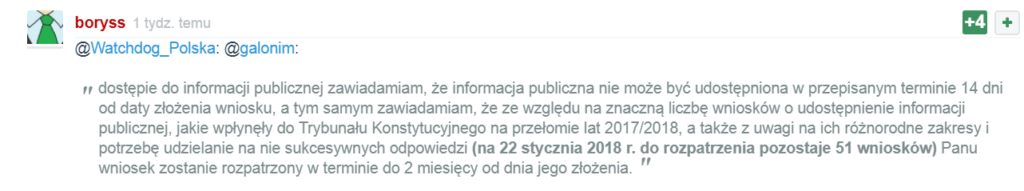 28 listopada 2017 r. skierowaliśmy do Trybunału Konstytucyjnego wniosek o udostępnienie owego problematycznego rejestru umów. Termin rozpatrzenia wniosku przedłużono do 2 miesięcy i 26 stycznia 2018 r., doczekaliśmy się odpowiedzi. Udostępniono nam rejestr umów, choć nie zawiera on informacji o wszystkich umowach zawartych od 1 stycznia 2017 r. do 28 listopada 2017 r. (data złożenia wniosku o udostępnienie informacji).