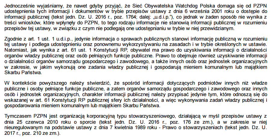 Już 9 lutego PZPN odpisał, że wnioskowane dokumenty nie stanowią informacji publicznej. Powrócił znany nam argument, że organizacje pozarządowe (stowarzyszenia, fundacje) nie podlegają zasadzie jawności.