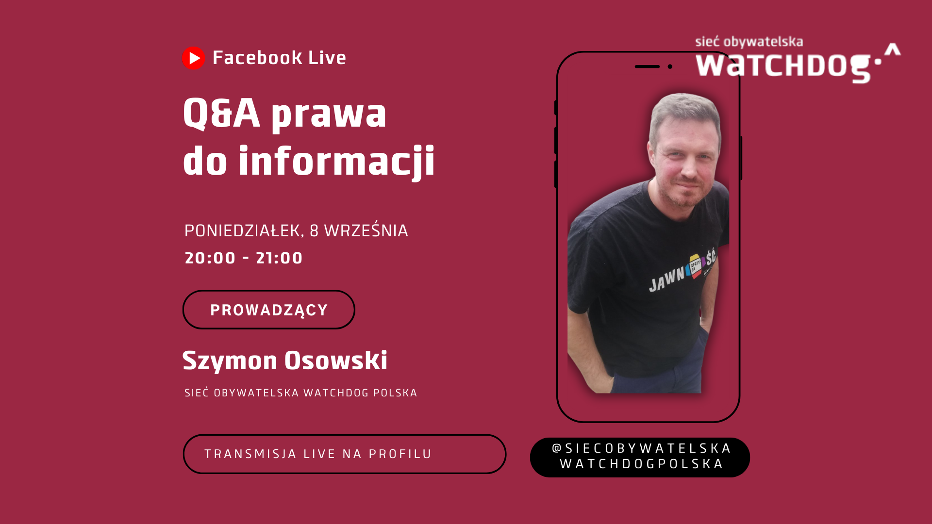 Zapraszamy wszystkie zainteresowane osoby na transmisję na żywo 8 września w godz. 20-21 na profilu Facebook Sieci Obywatelskiej Watchdog Polska – https://www.facebook.com/SiecObywatelskaWatchdogPolska